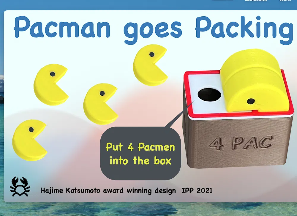 Mô hình xếp hình độc đáo với 4 mảnh Pacman phải nhét vừa vào hộp qua khe hở giới hạn. Thiết kế bởi Hajime Katsumoto, đoạt giải tại International Puzzle Party 2021. Thích hợp in với PLA, STL. Xem video để có giải pháp.
