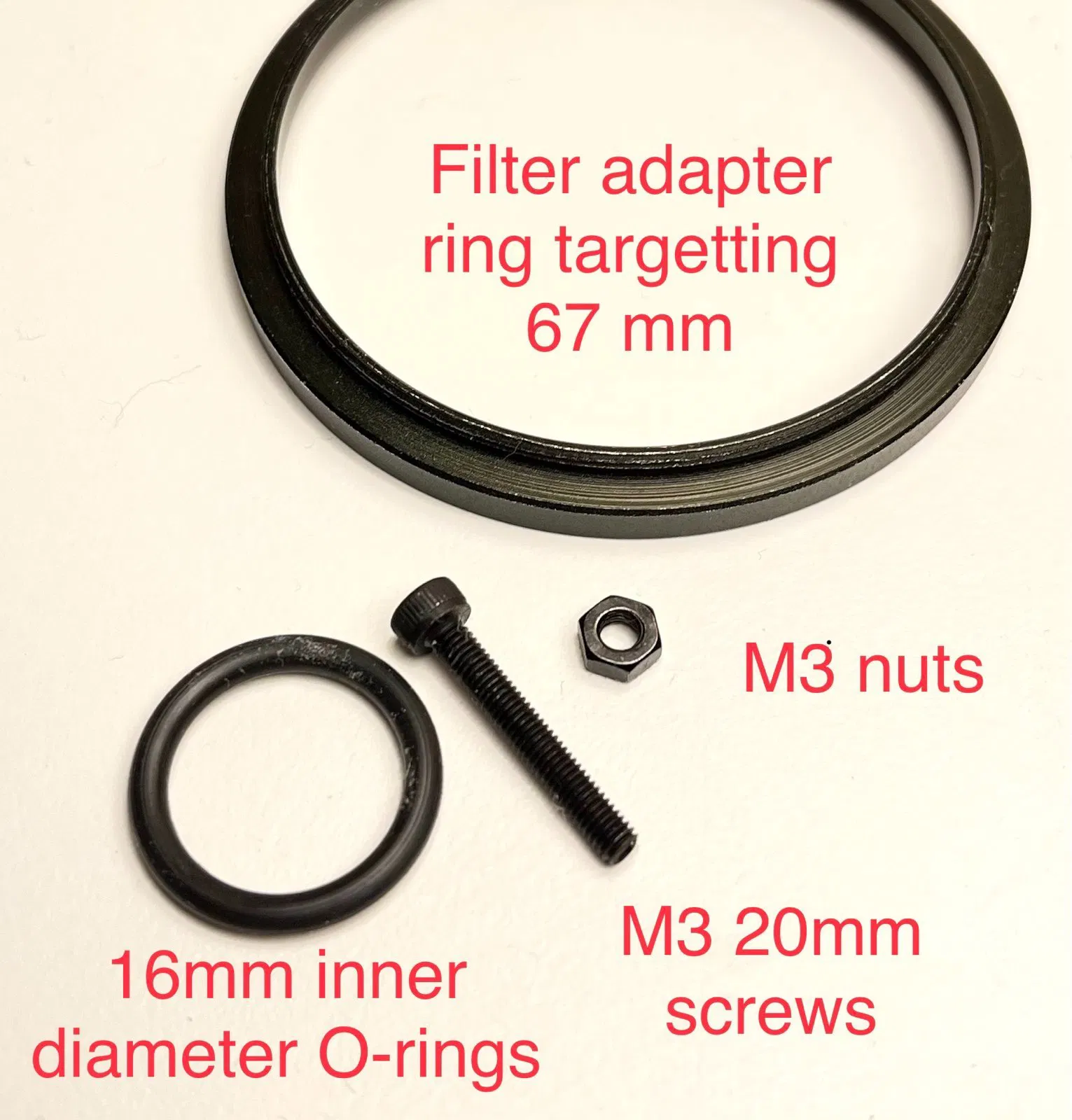 - Vòng adapter lọc có kích thước tăng dần 67 mm (có thể cần nhiều vòng tăng dần). Điều này có nghĩa là hiện tại chỉ tương thích với các ống kính có ren lọc nhỏ hơn 67 mm.