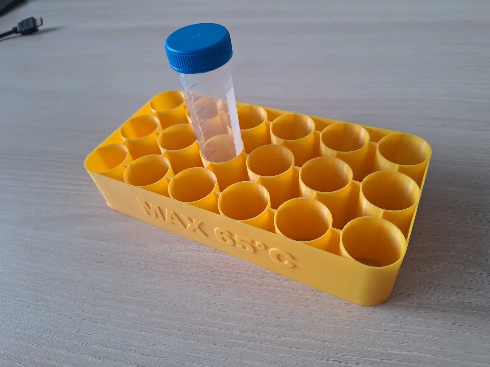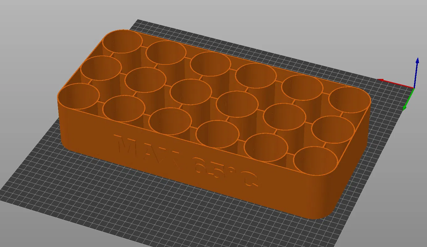 Giá đỡ ống Falcon 50mL chắc chắn nhưng siêu nhẹ, chỉ tốn khoảng 100g filament. Thiết kế đặc biệt để giữ chặt và tự động định tâm các ống, khoảng cách giữa các ống được tính toán kỹ để không cấn nắp. Có hai phiên bản: một có nhắc nhở "MAX 65°C", phiên bản còn lại thì không.