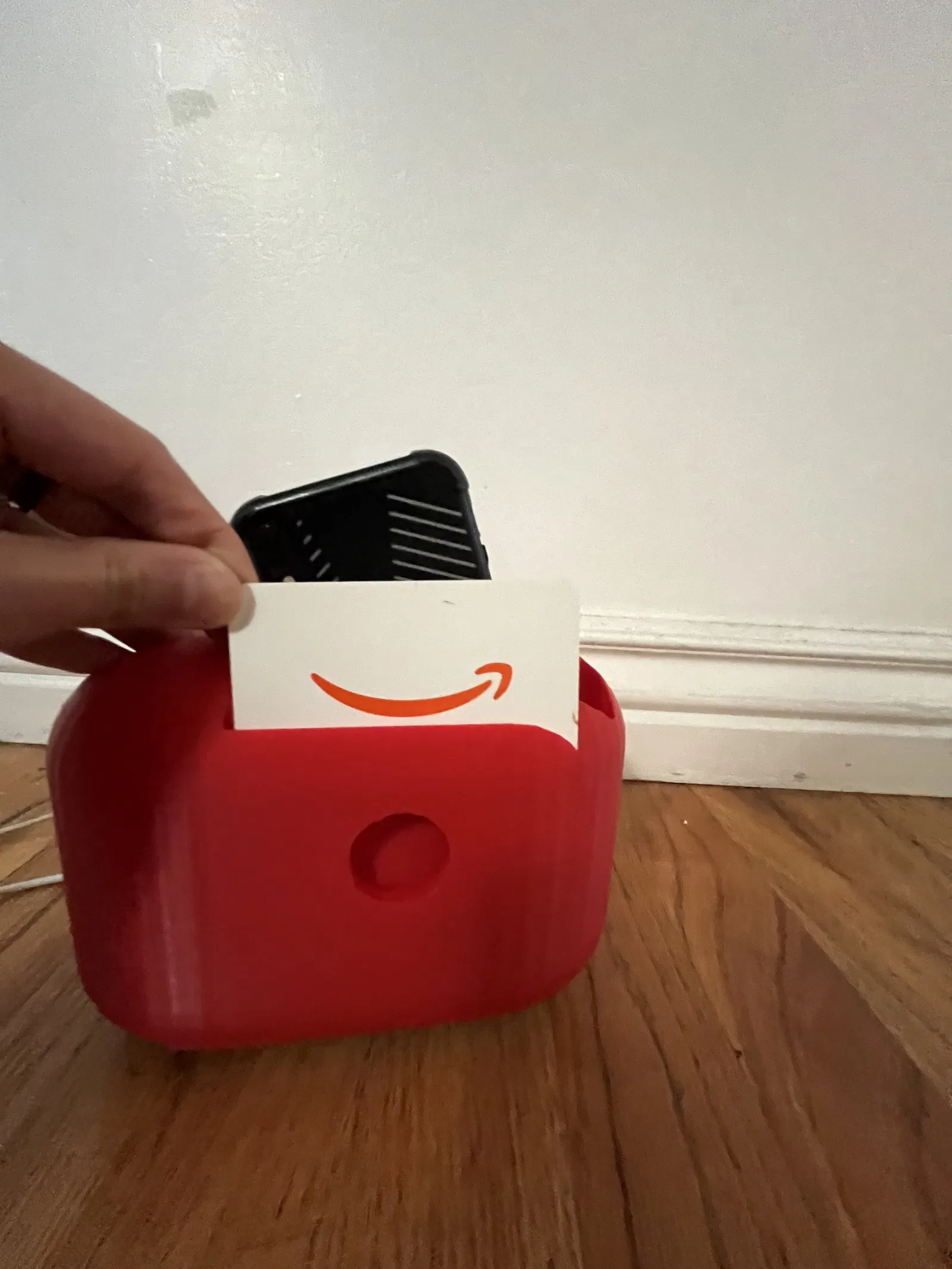 Đây là một chiếc đế sạc đa năng có thể giữ cùng lúc tối đa 3 chiếc điện thoại, từ 2-4 tấm thẻ (bạn có thể dùng để đựng danh thiếp quan trọng), một hộp AirPods hoặc tai nghe không dây khác có cổng sạc ở đáy, và một ít tiền xu. Mẫu này đã được kiểm tra thực tế với các thiết bị: iPhone 13, iPhone 14 Plus, iPhone XR và AirPods 4. Khe để tiền xu đã được thử nghiệm với tiền xu (loại dimes) và khe cắm thẻ đã được thử nghiệm với thẻ quà tặng Amazon.