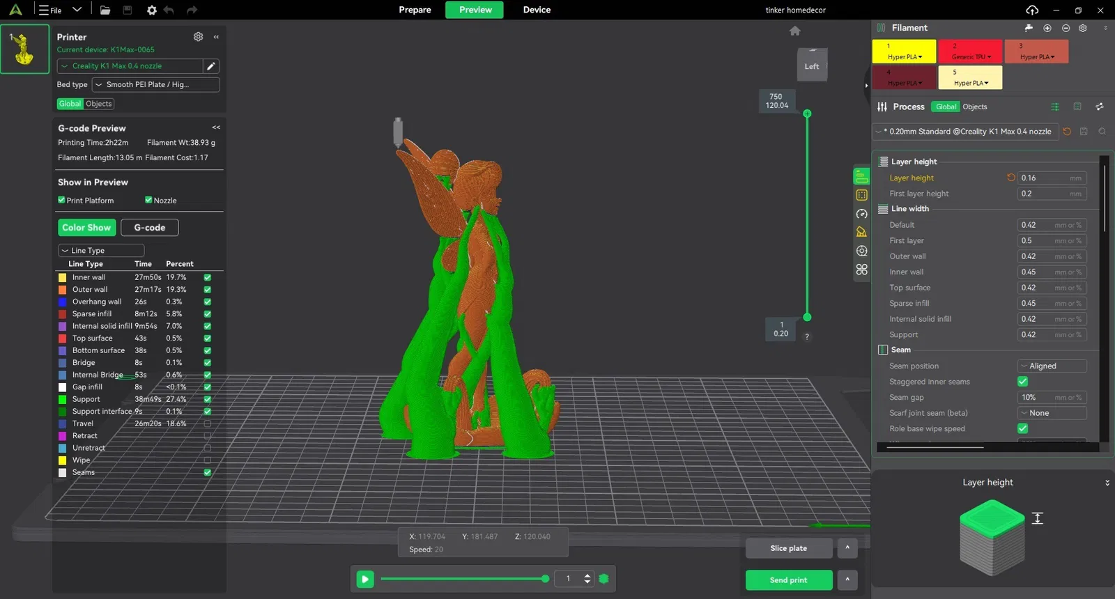 Nên dùng nhựa PLA hoặc ABS chất lượng cao để đảm bảo độ bền. Độ cao lớp in (layer height) từ 0.1 đến 0.2 mm được khuyến khích để giữ lại các chi tiết tinh xảo. Bạn cần thêm hỗ trợ (supports) cho các phần nhô ra như đôi cánh.