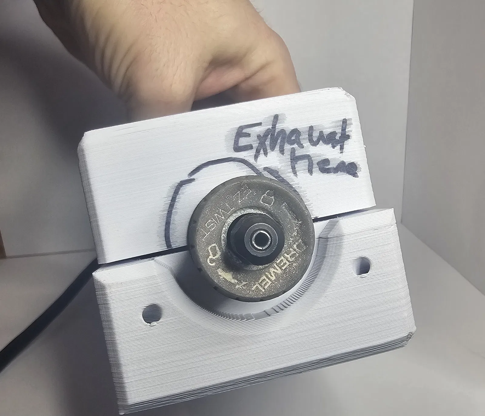 Thiết kế này dành cho Dremel 4000. Các cổng thoát nhiệt ở phía trước giúp thổi luồng khí về phía mũi cắt để loại bỏ bụi gỗ, đồng thời luồng khí phụ thổi sang hai bên để tránh quá nhiệt cho máy.