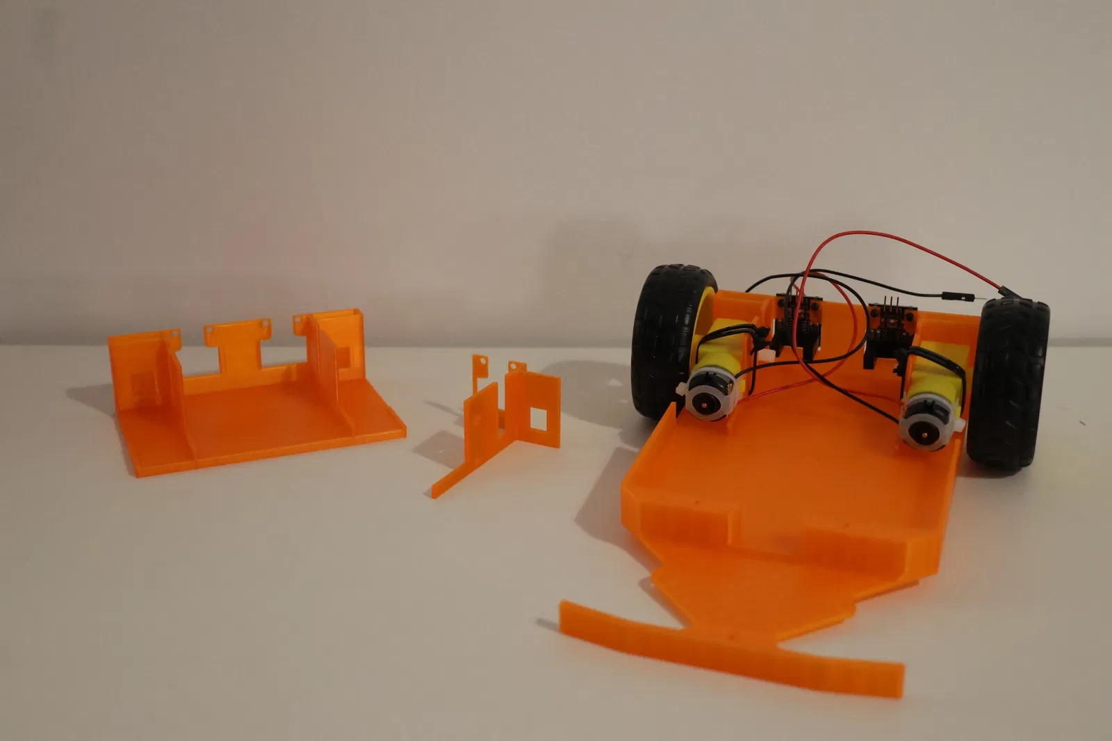 - Lắp ráp: Các hốc chứa motor được làm vừa khít, nếu nhựa co rút nhẹ khiến motor bị lỏng, bạn có thể dùng thêm một ít keo dán nhựa hoặc băng dính hai mặt để cố định chắc chắn hơn.