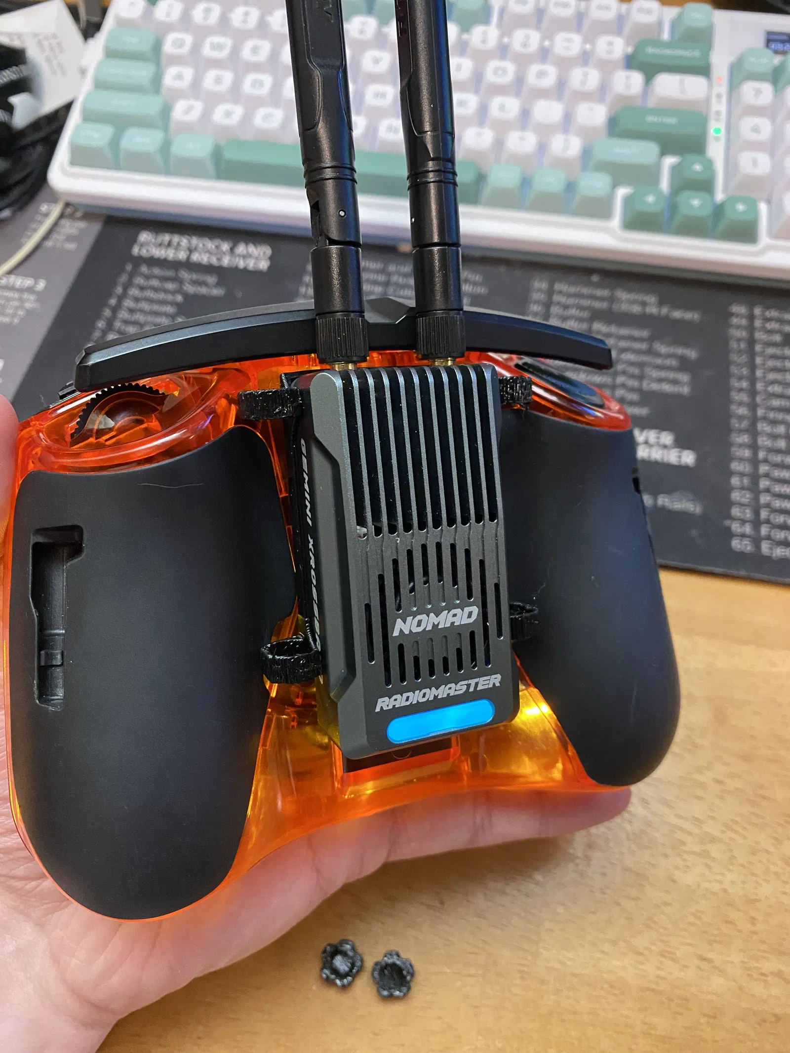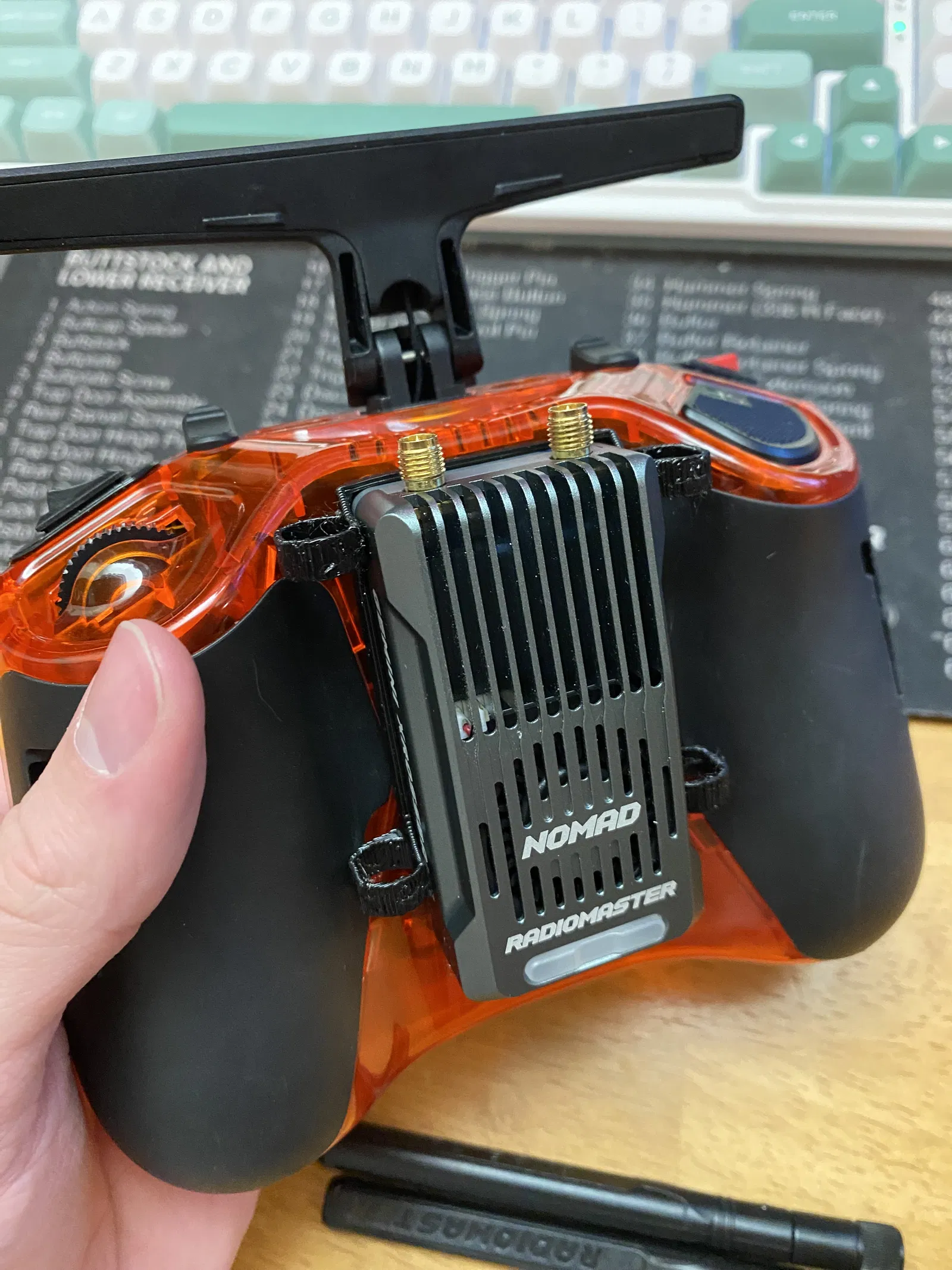 Tôi có một vài bộ thu (receiver) vẫn đang chạy phiên bản ELRS cũ mà không cập nhật được, nên với con Pocket chạy firmware 3.x.x, tôi có thể kết nối được với chúng, trong khi con Nomad và các bộ thu còn lại thì đang chạy bản 4.x.x mới nhất. Việc có tới 3 bộ phát (Pocket tích hợp, Nomad 2GHz + 915 MHz) cực kỳ tiện lợi, nhưng tôi luôn thấy hơi bất tiện khi phải để con Nomad nằm lăn lóc trong túi mỗi khi không dùng đến.