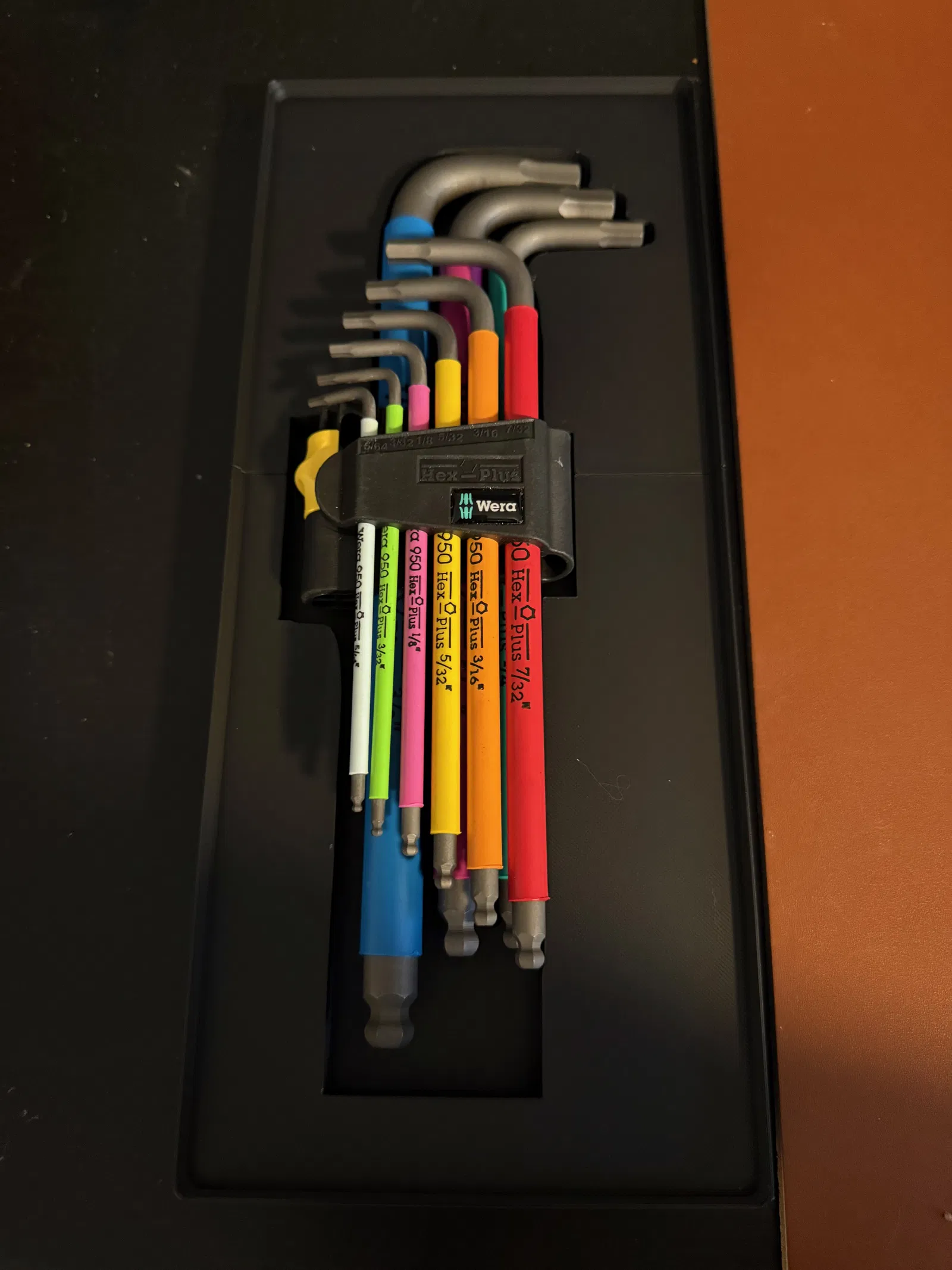 Khay Gridfinity cho bộ lục giác Wera 05022640001 950/9 Hex-Plus Multicolour Imperial. Được tạo bằng tracefinity. Kích thước lưới 7x3, vì vậy được chia thành hai phần khay (có thể dán lại với nhau). Bạn có thể in hai phần này cạnh nhau trên bàn in kích thước 256mm.