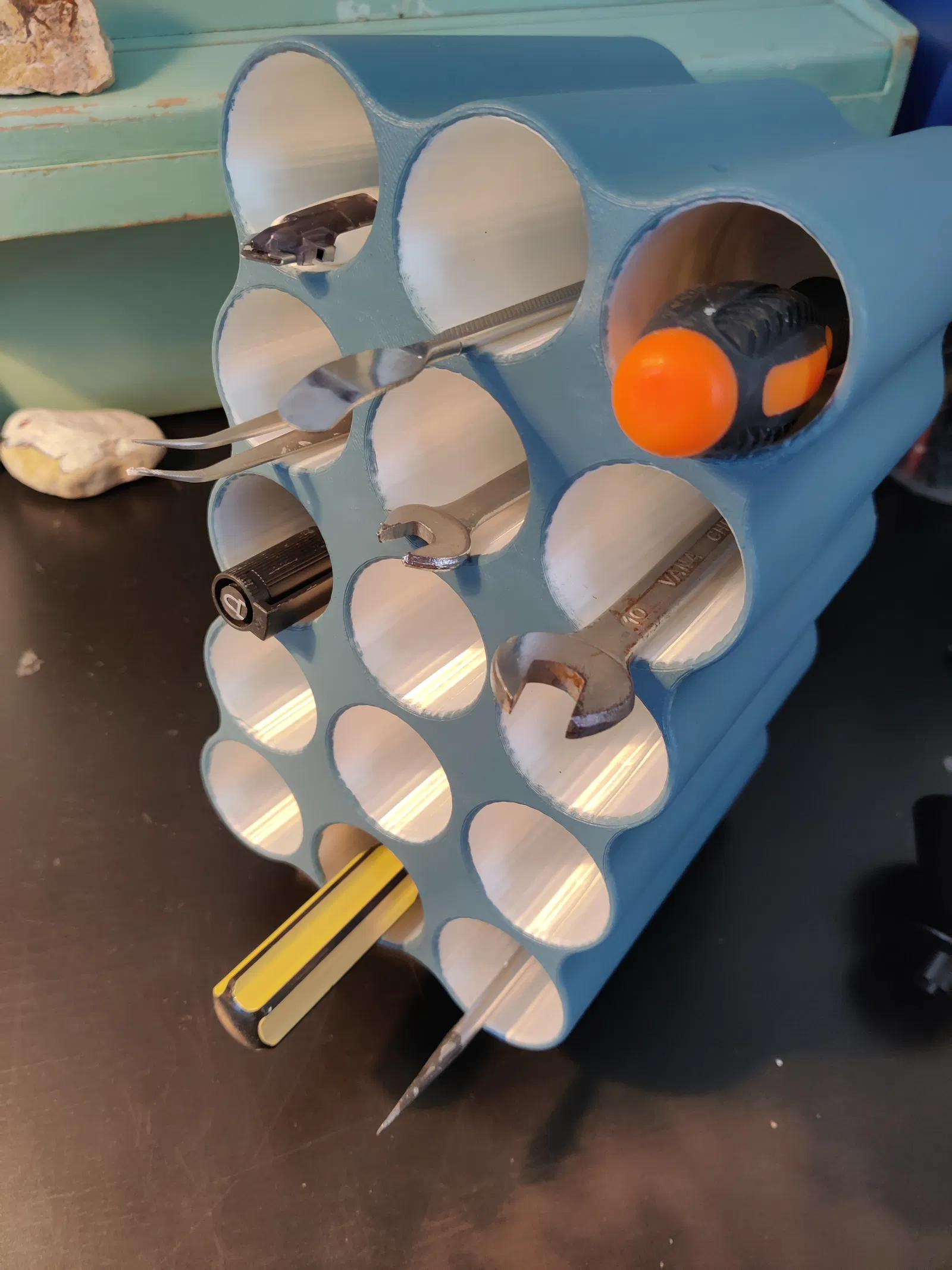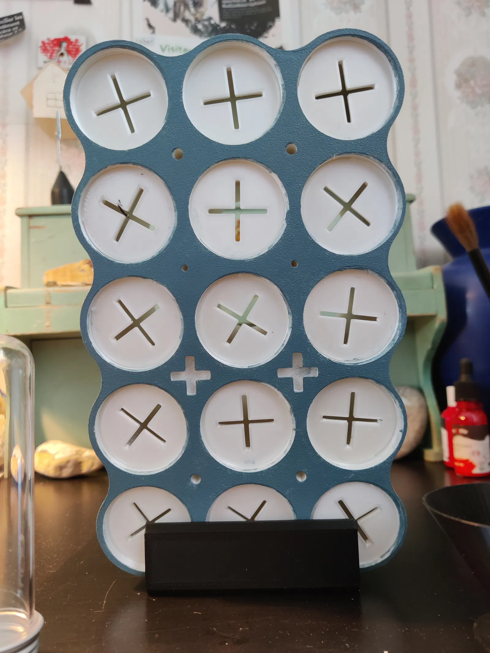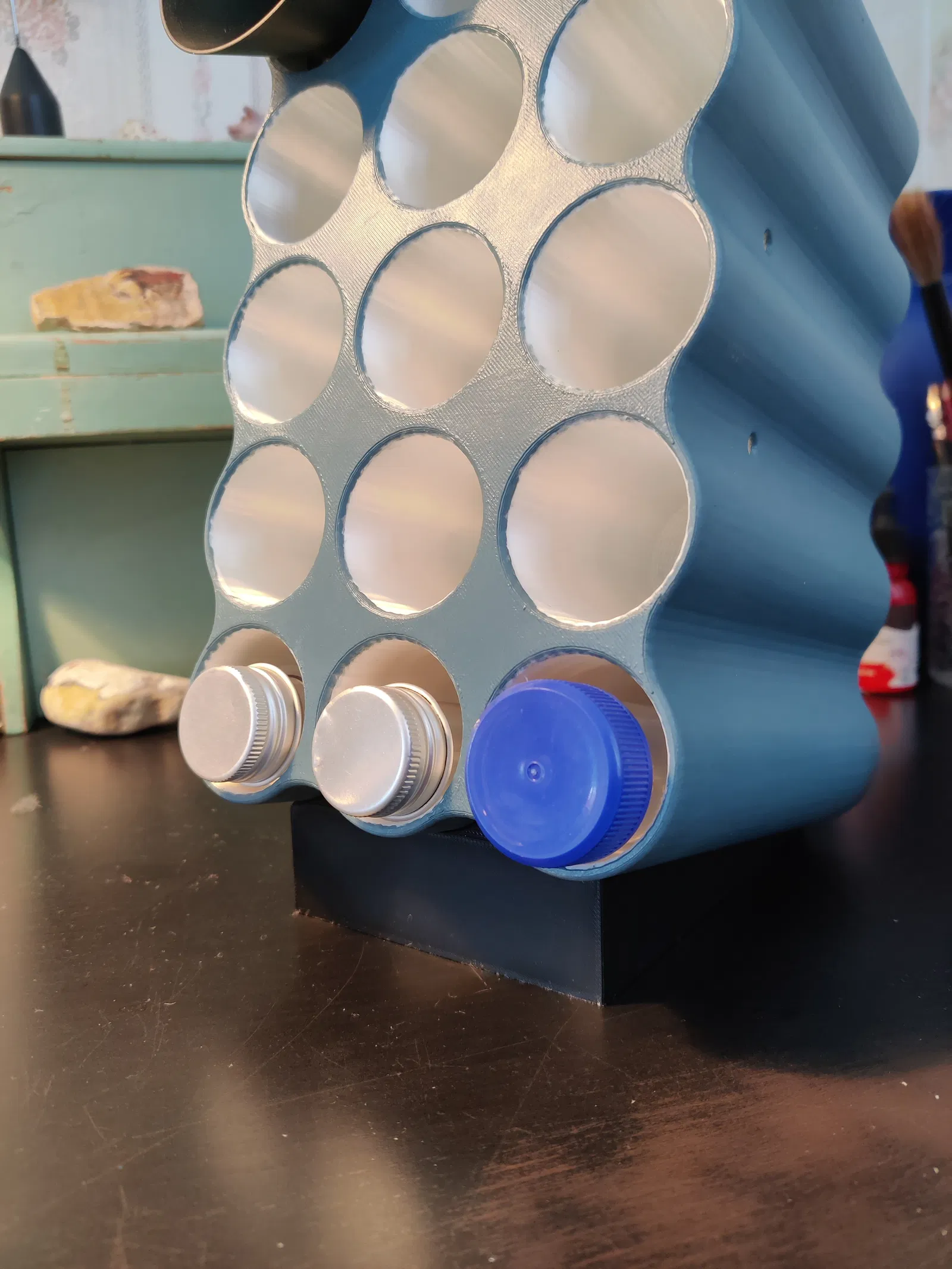 Đây là một giá đỡ đa năng cho nhiều mục đích sử dụng khác nhau. Giá có 15 khe cắm có ren, cho phép bạn tùy chỉnh độ sâu linh hoạt. Chiều dài: 13,5 cm / Đường kính: 39,5 cm. Ngoài ra, phía sau giá còn được thiết kế các điểm lắp đặt bao gồm bốn bu lông M6, hai lỗ bắt vít tự khoan và hai hốc lõm để ẩn đầu vít. Tái bút: Mẫu trong ảnh là bản thử nghiệm nên mình đã loại bỏ các lỗ bên hông. Lúc đầu mình định ghép nhiều khối lại với nhau nhưng sau đó đã đổi ý không làm nữa.