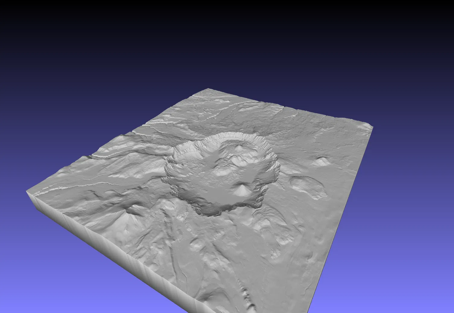Đây là mô hình 3D của Vườn quốc gia Crater Lake và các khu vực lân cận (Oregon, Mỹ), được tạo ra từ các bộ dữ liệu độ cao và độ sâu có độ phân giải cao, xử lý bằng QGIS. Mô hình này kết hợp dữ liệu độ sâu từ sonar đa tia (khảo sát tháng 7 năm 2000) và dữ liệu độ cao địa hình chi tiết (khảo sát LiDAR, tháng 8–9 năm 2010) để tái hiện lòng hồ cùng cảnh quan xung quanh một cách chân thực.