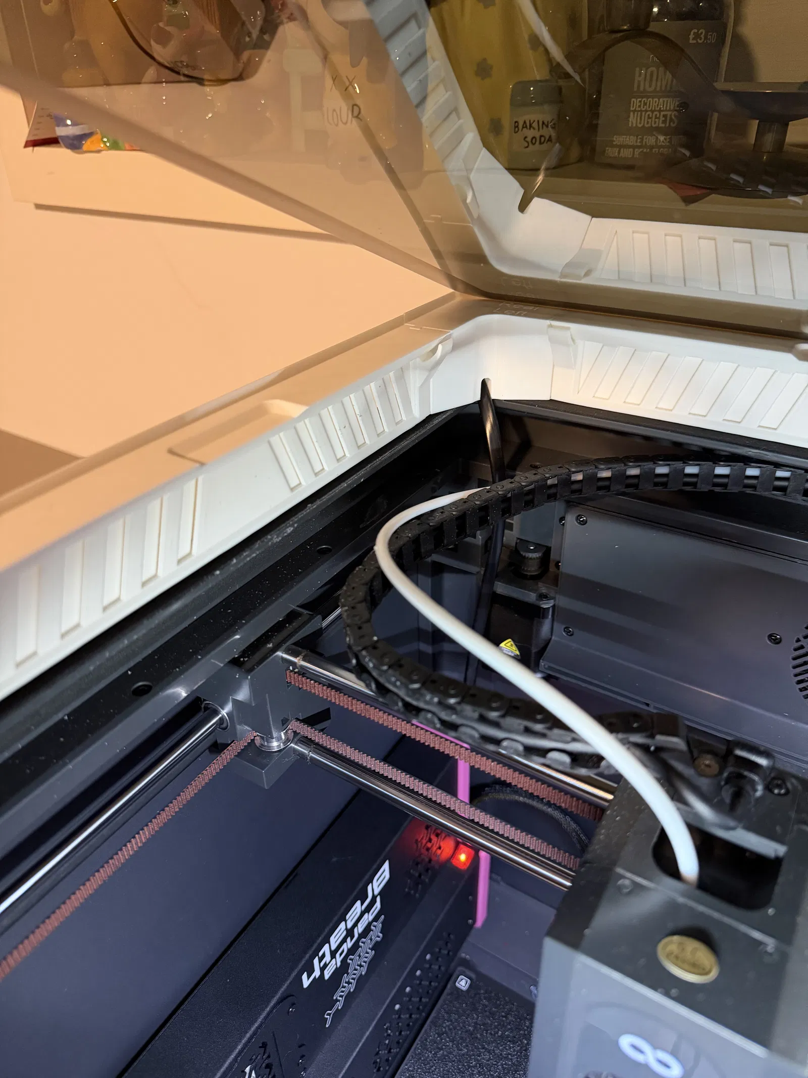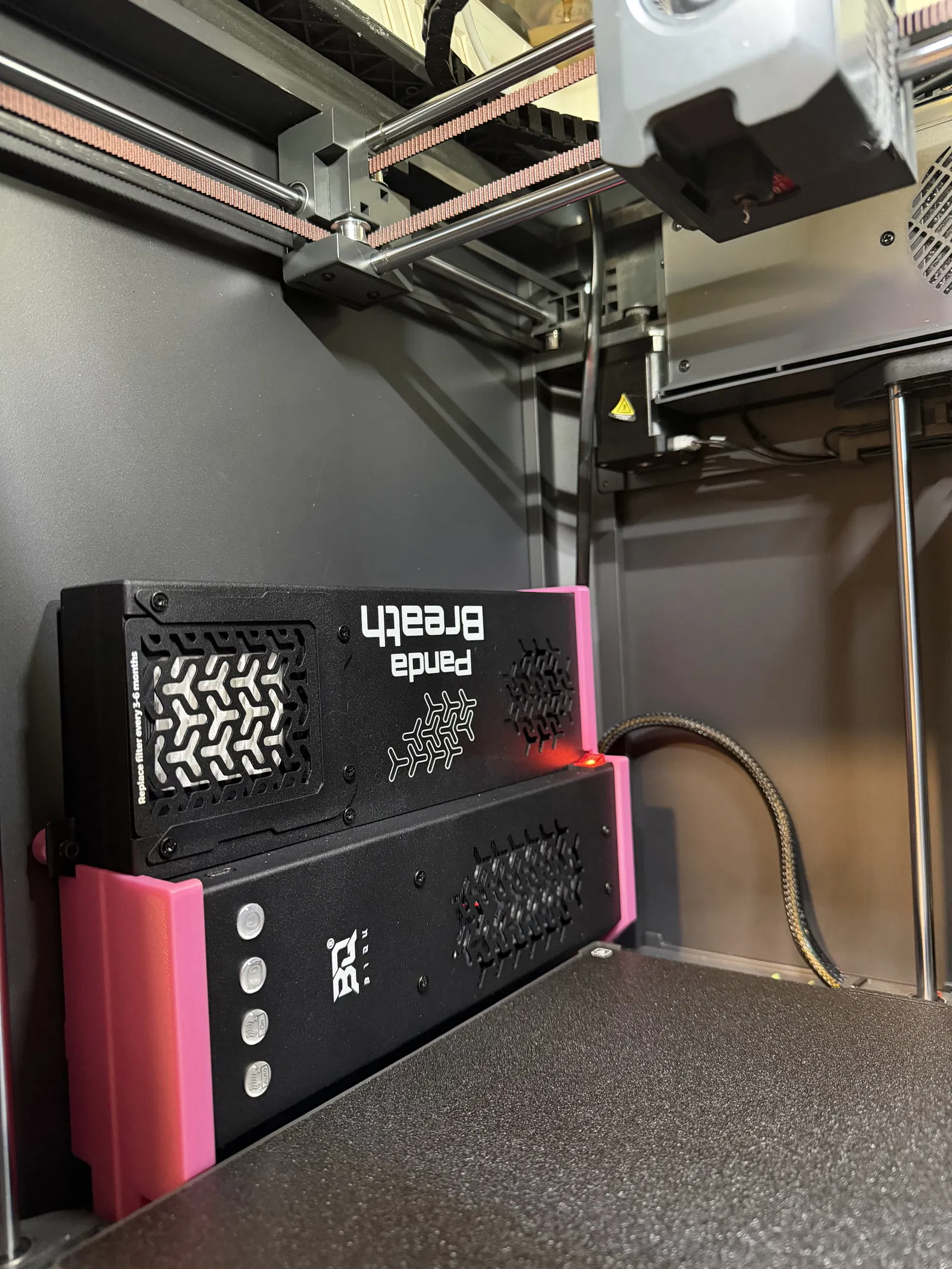 Mình đã chỉnh sửa file STL của ngàm Panda Breath chính thức (xem tại đây) vốn dành cho Snapmaker U1, bằng cách thêm các "chân" và lỗ nam châm để gắn Panda Breath nằm ngang vào vách bên trái của máy Centauri Carbon, đồng thời luồn cáp nguồn qua phần khung riser.