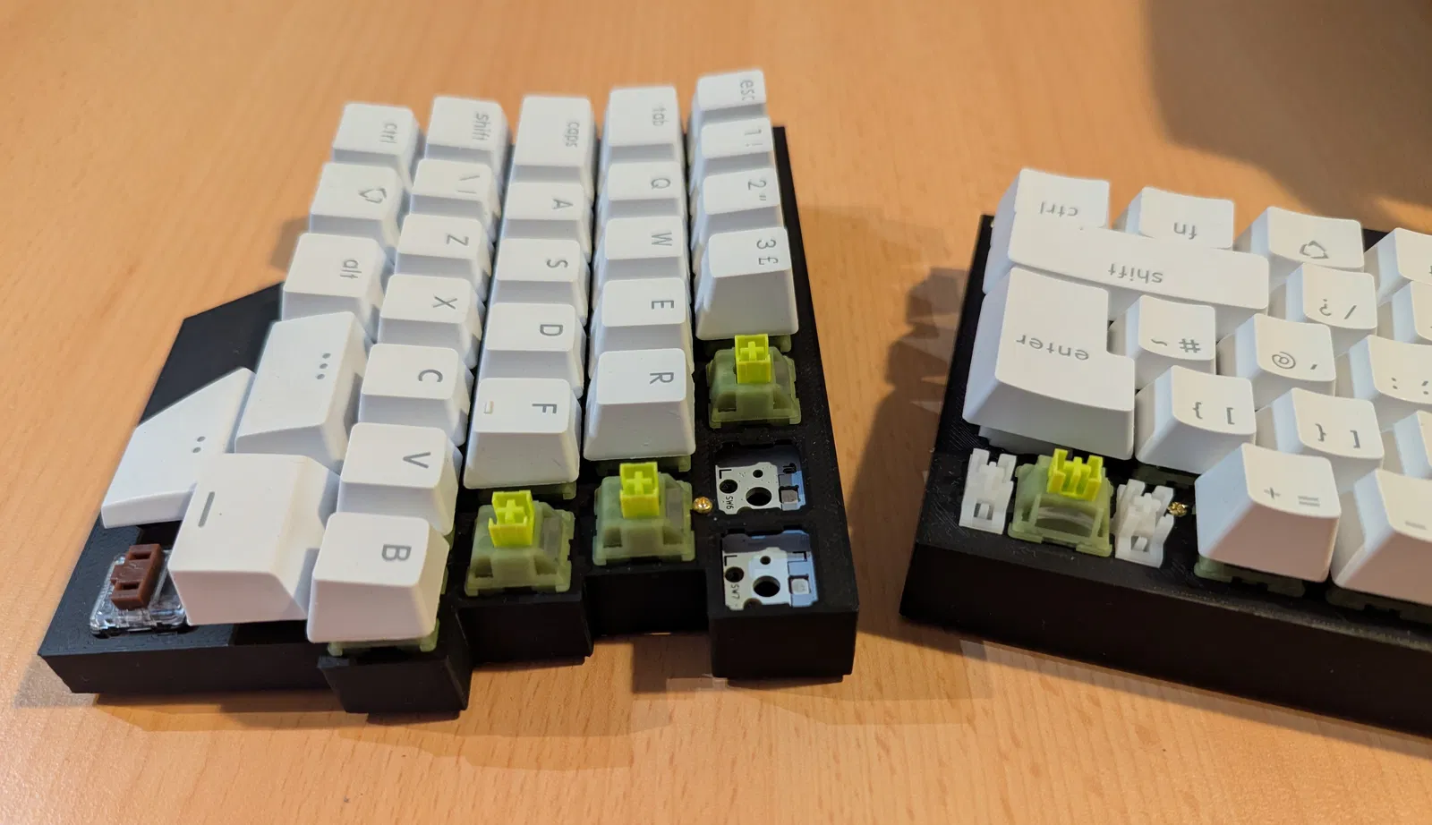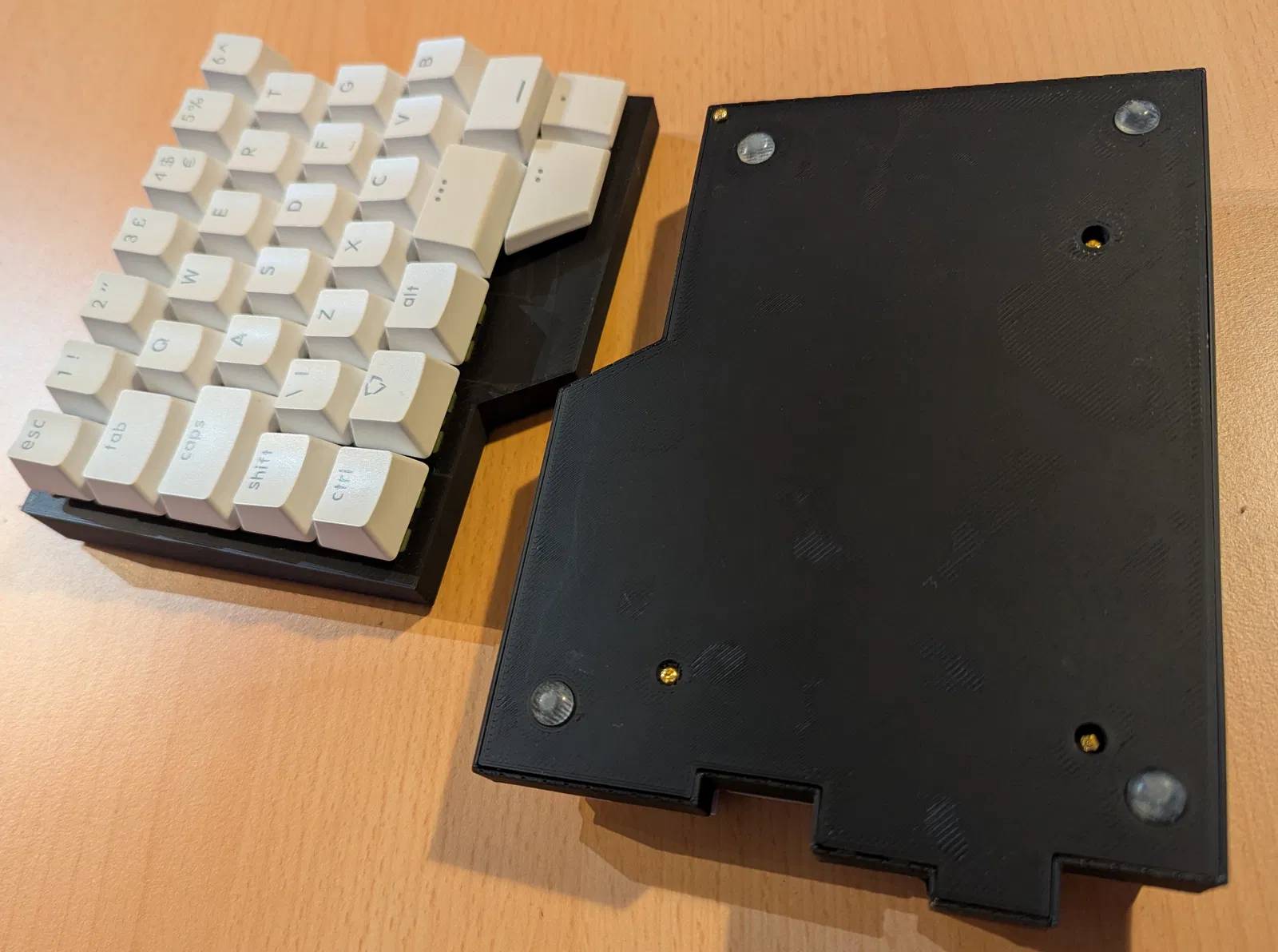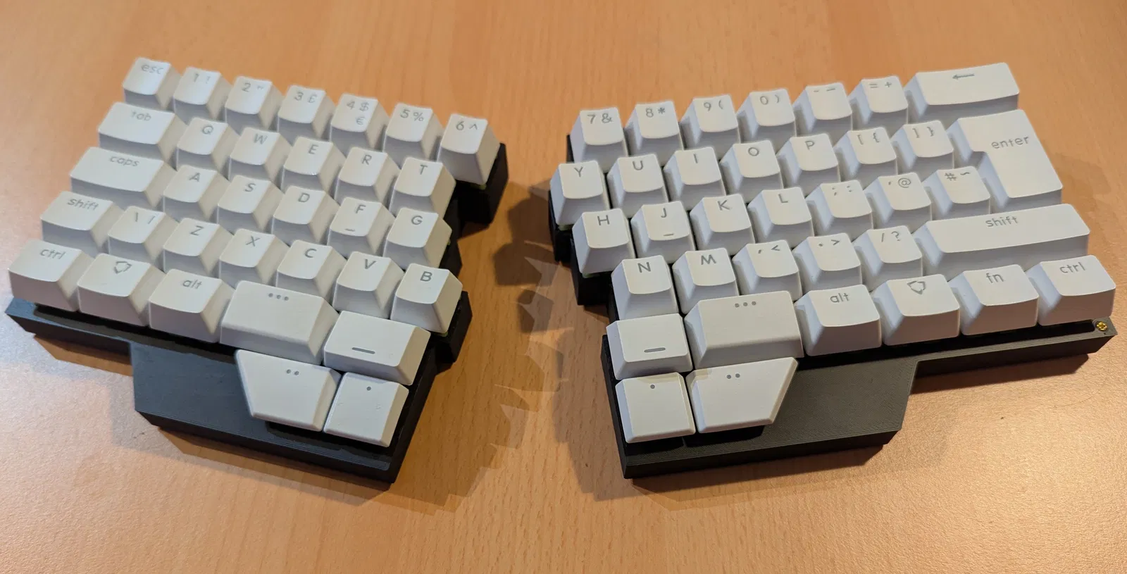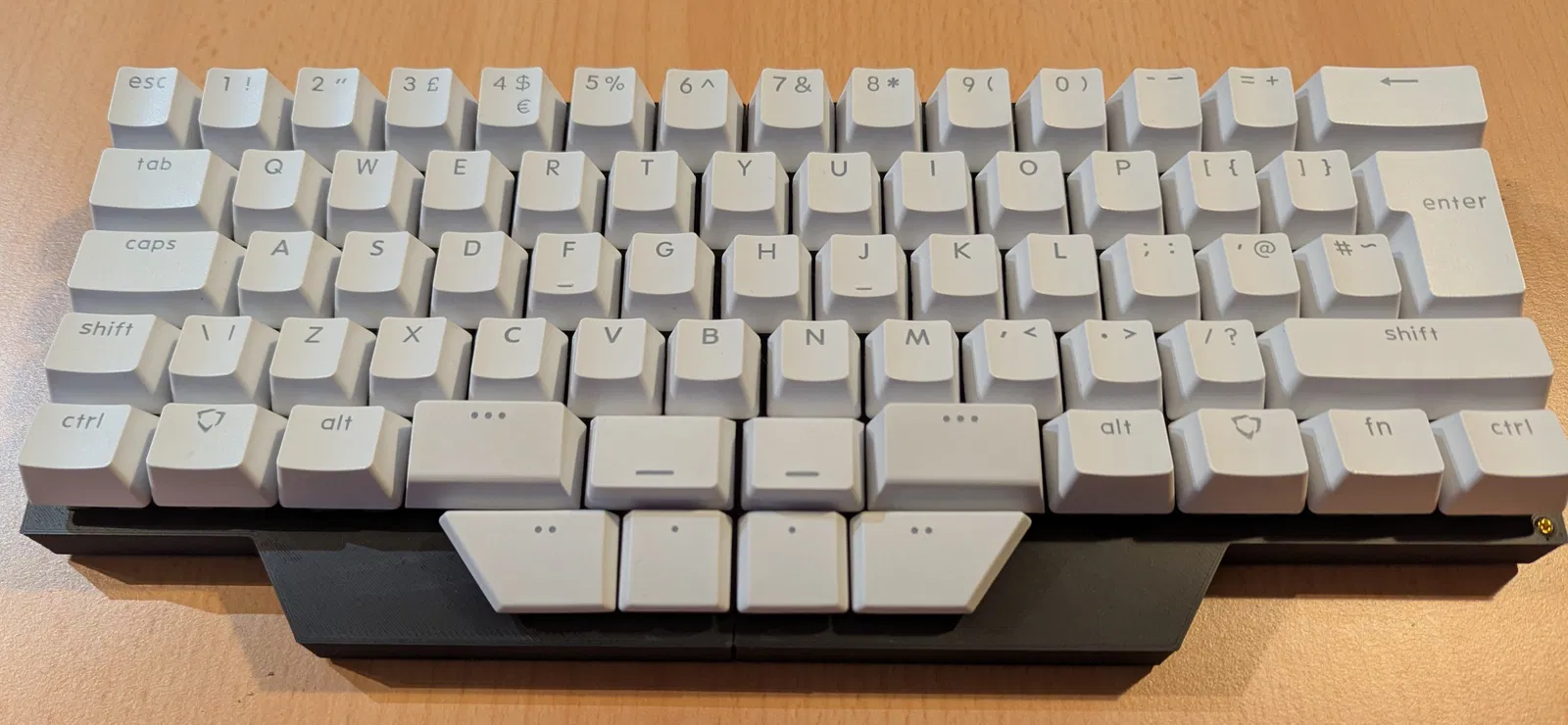 Mình muốn thử cảm giác dùng bàn phím mà không có kê tay sẽ như thế nào. Hai nửa bàn phím vẫn có thể đặt sát vào nhau, dù không có cơ chế khóa lại. Tấm top plate được thiết kế chỉ dành riêng cho layout ISO. Các linh kiện cần thiết: 16 con ốc M2 x 5mm, 8 trụ đồng M2 x 10mm, 8 chân cao su (đường kính khoảng 8mm). Đây vẫn chỉ là bản thử nghiệm nên còn nhiều điểm cần khắc phục và cải thiện. Các vấn đề đã biết: Một trong các vị trí trụ giữa top plate và bottom plate của nửa bên trái bị lệch, PCB tại đó không có lỗ nên chỉ gắn được 3 trụ. PCB không bắt ốc cố định được do không gian hạn chế để lắp đai ốc, nên nó chỉ được ép giữa các trụ và giữ bằng switch. Điều này khiến switch và socket phải chịu lực ngang khi cắm dây USB. Stabilizer bị lỏng do các rãnh không khớp. Switch của phím Enter bị lỏng do hướng của stabilizer. Các phím choc hơi lỏng do rãnh trên top case được thiết kế để mở switch mà không cần tháo phím. Hướng cải thiện: Bo góc (Fillets). * Thêm miếng đệm giữa top plate và PCB nhỏ. Một vài lưu ý cho bạn nào muốn làm tương tự cho bản ANSI hoặc các loại bàn phím khác. Vì mình không tìm thấy mô hình 3D chính thức nào nên đã tự thiết kế từ đầu: 1. Truy cập https://keyboard-layout-editor.com/ -> Presets -> ISO 60%. Xóa phím Space và thay bằng 4 phím: 1.5u, 1.25u, 1.75u, 1.25u. Bạn có thể di chuyển các phím nửa bên phải sang một chút bằng cách chọn tất cả rồi dùng phím mũi tên. Mình đã thử thêm phím thumb ở đây nhưng vị trí chưa chuẩn nên cuối cùng đã tinh chỉnh lại trong phần mềm CAD. 2. Truy cập http://builder.swillkb.com/. Dán dữ liệu “raw data” từ trang trước vào. Lưu ý chọn stabilizer là Cherry (mình đã quên bước này nên bản upload bị lỏng). Đặt kích thước phím là 18.8mm. Nhấn “Draw CAD”. 3. Nhập file dxf vào phần mềm CAD để làm mẫu cho top plate. 4. Thiết kế case bằng cách đo đạc kỹ lưỡng các thông số từ case gốc để xác định vị trí trụ, ốc và hình dáng.