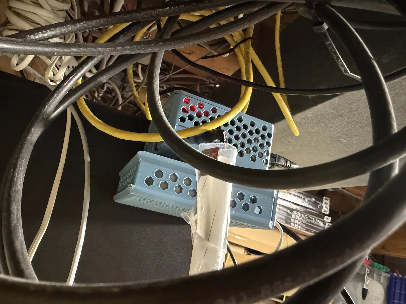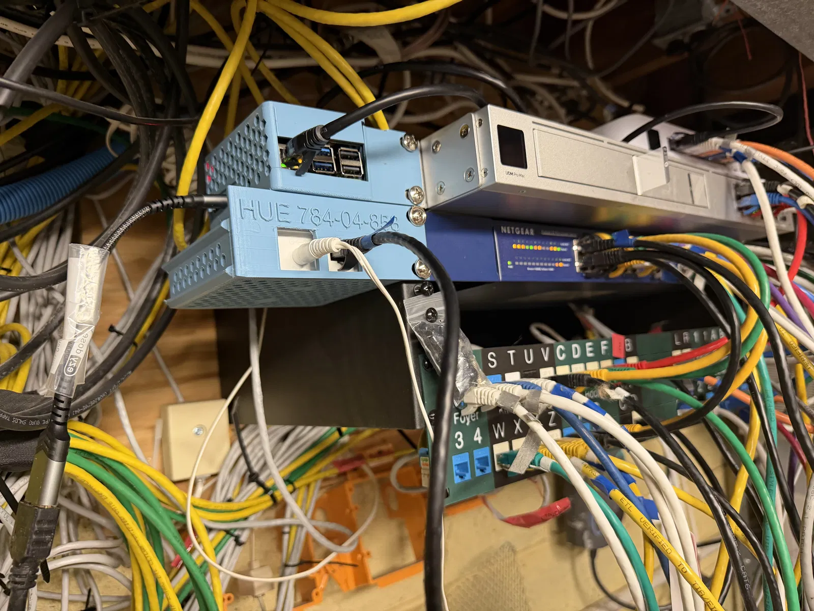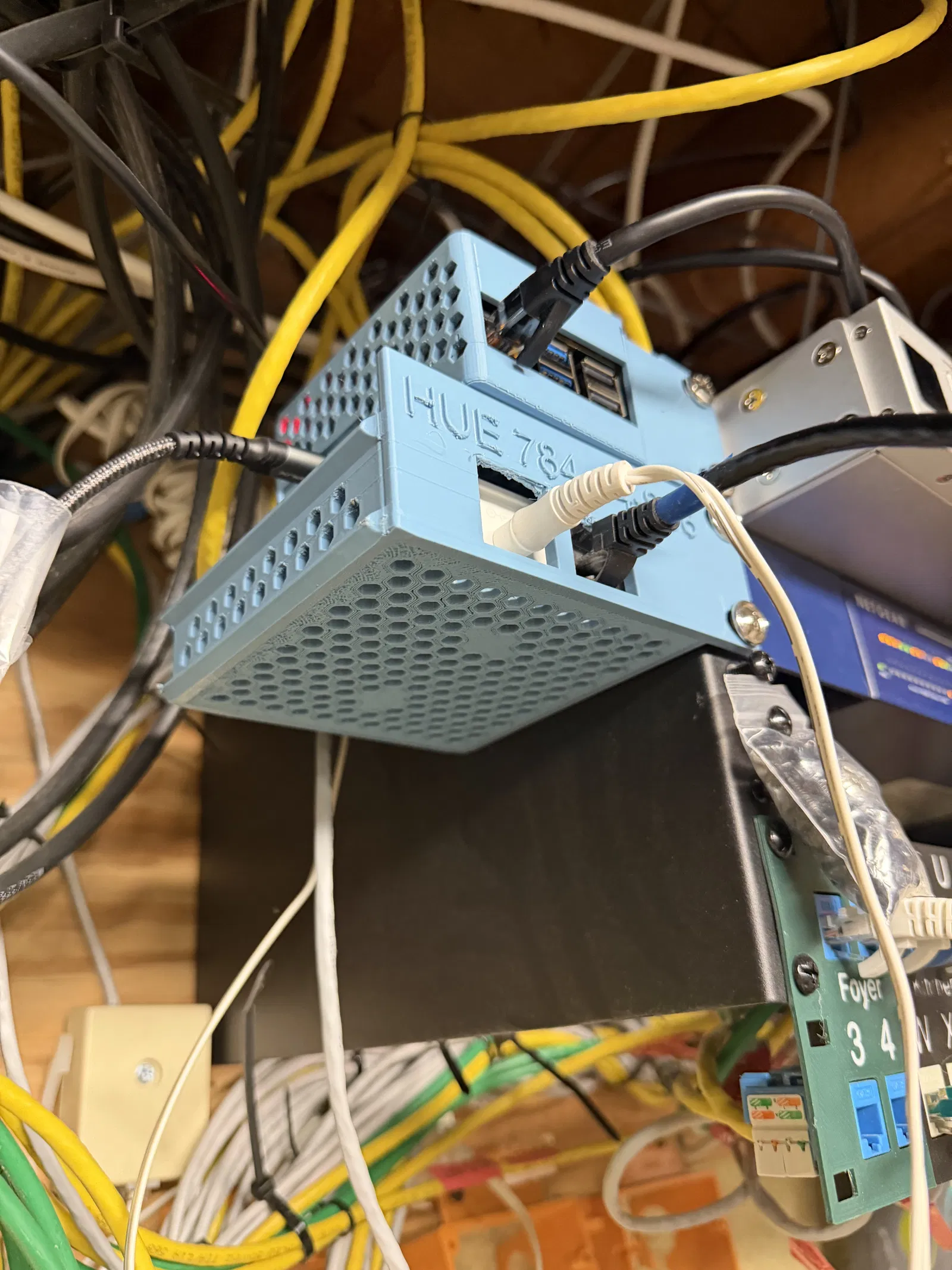 Vì không đủ chỗ trong tủ rack 19 inch nên mình đã thiết kế giá treo này để gắn các thiết bị nhỏ như Philips Hue Bridge ra bên ngoài. Một giải pháp gọn gàng giúp tiết kiệm không gian tủ rack mà vẫn đảm bảo thao tác dễ dàng.