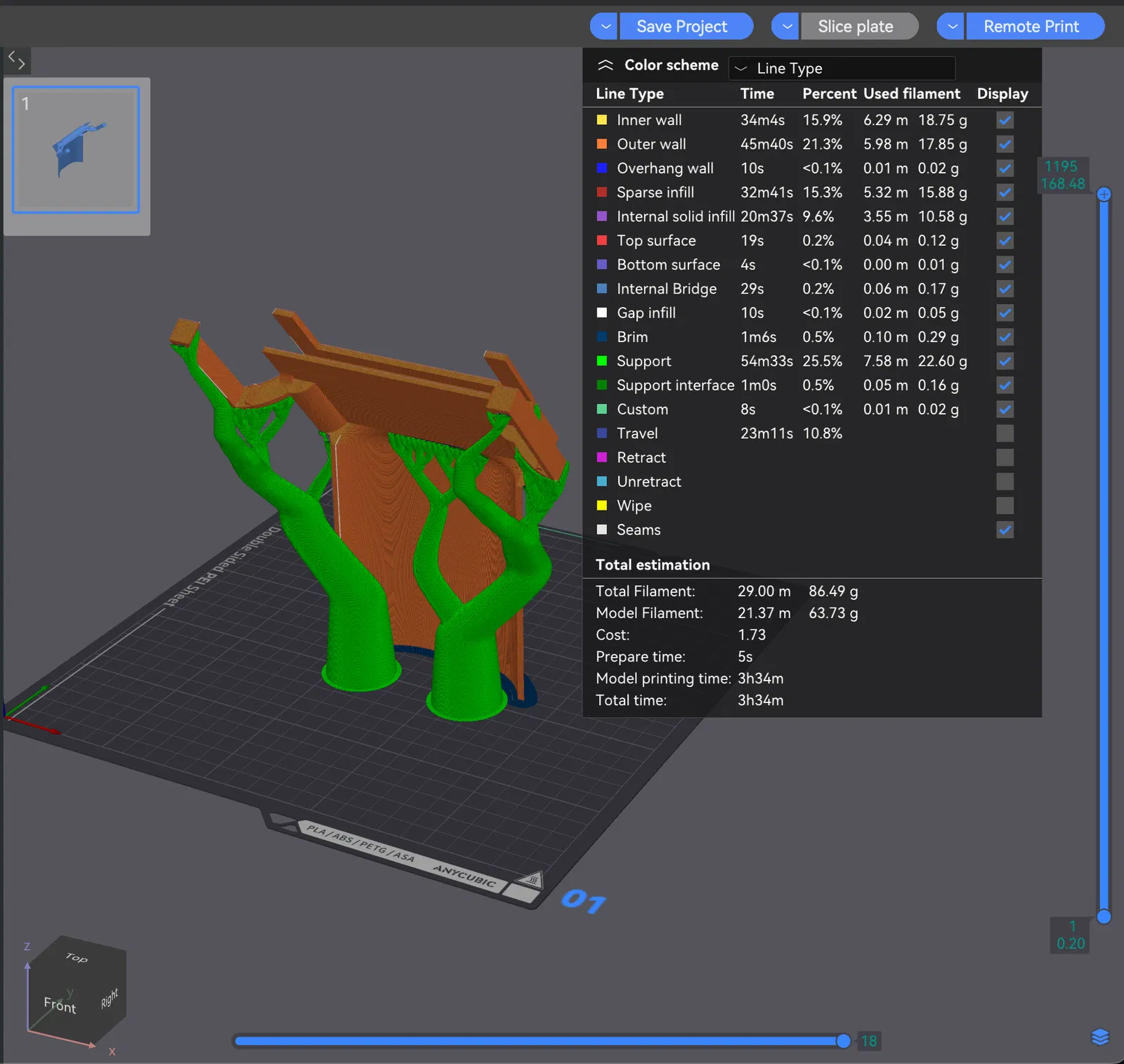 - Cần có support (hỗ trợ in). Mình đã in bằng cách dựng đứng phần chắn bùn lên, hướng các chốt kẹp lên phía trên (anh em xem hình để rõ hơn nhé).