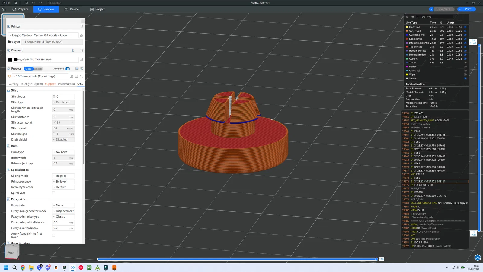 Mình in cái này bằng nhựa SirayaTech TPU85A, nhưng thực ra dùng bất cứ loại nhựa nào hơi dẻo một chút là ổn, thậm chí PETG cũng được.