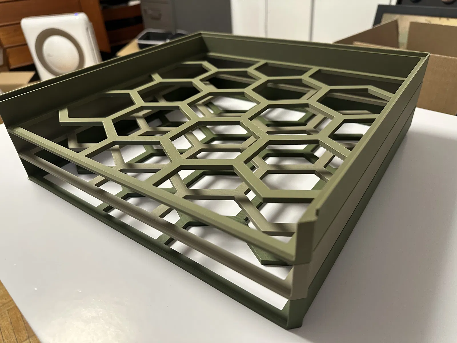 Điểm đặc biệt của thiết kế này chính là khả năng chồng tầng linh hoạt. Bạn có thể in nhiều khay và xếp chồng chúng lên nhau để tiết kiệm không gian trên bàn làm việc, tạo thành một chiếc tủ nhỏ gọn chứa được hàng chục tờ giấy mà vẫn giữ cho chúng không bị nhăn hay gập mép. Phần mặt đáy được thiết kế theo họa tiết tổ ong rất đẹp mắt, vừa giúp giảm lượng nhựa tiêu thụ khi in, vừa tạo độ thông thoáng, giúp bạn dễ dàng nhìn thấy màu sắc của các tờ giấy bên dưới mà không cần nhấc khay lên.