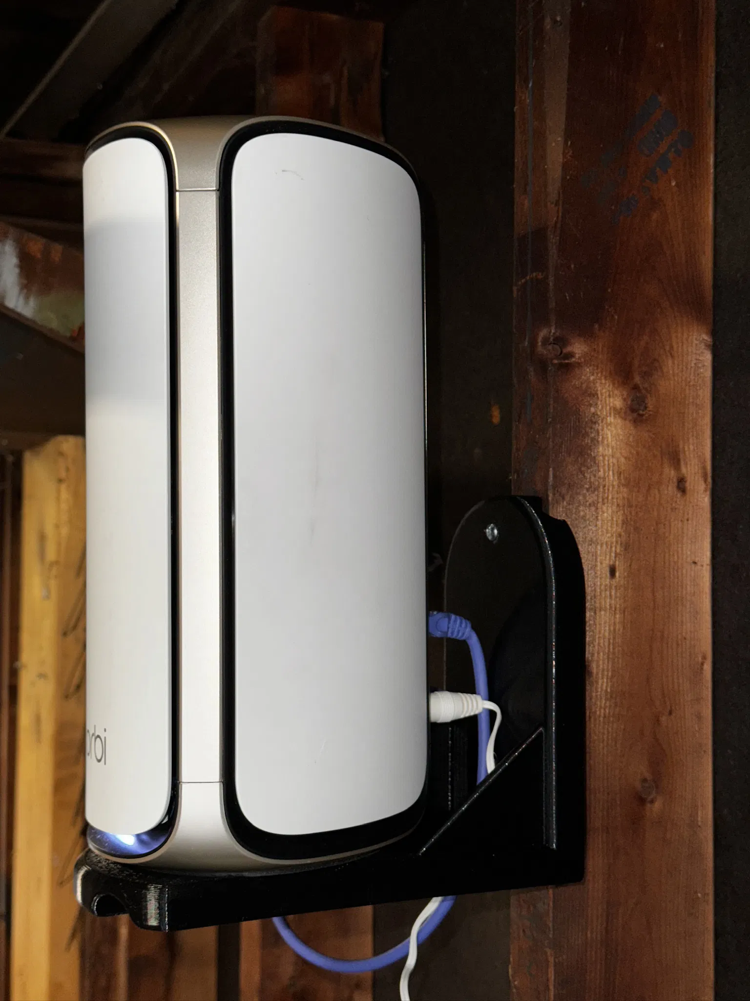 Mình không muốn tốn 40 USD cho mỗi cái giá treo tường của Netgear nên mình đã tự thiết kế một bộ riêng. Mình in bằng nhựa PETG của Prusament với đầu in 0.6mm, sử dụng thiết lập 'draft fast' trong Prusa Slicer. Giá treo được làm rất dày dặn vì bộ router/satellite này khá nặng. Bạn BẮT BUỘC phải dùng 2 ốc vít M4x16mm xuyên qua giá treo vào các lỗ bắt vít của thiết bị. Vui lòng đừng bỏ qua bước này. Các lỗ bắt vít phía sau có thể khoan rộng ra nếu cần hoặc cứ bắt vít trực tiếp qua. Các rãnh ở mặt đáy và mặt sau có thể dùng để đi dây cáp. Mình mới chỉ thử nghiệm với nhựa PETG. Khi in, hãy bật hỗ trợ (support) chỉ trên bề mặt bàn in. Ngày 18-06-2024: Đã thêm phiên bản dài hơn 10cm để đi dây cáp thoải mái hơn với một số dòng router, phiên bản này tương thích với cả RS700S. Tương thích với: Hệ thống router BE27000, RBE973S(B), RBE971, RBE970 Satellite, RS700S (phiên bản +10mm).