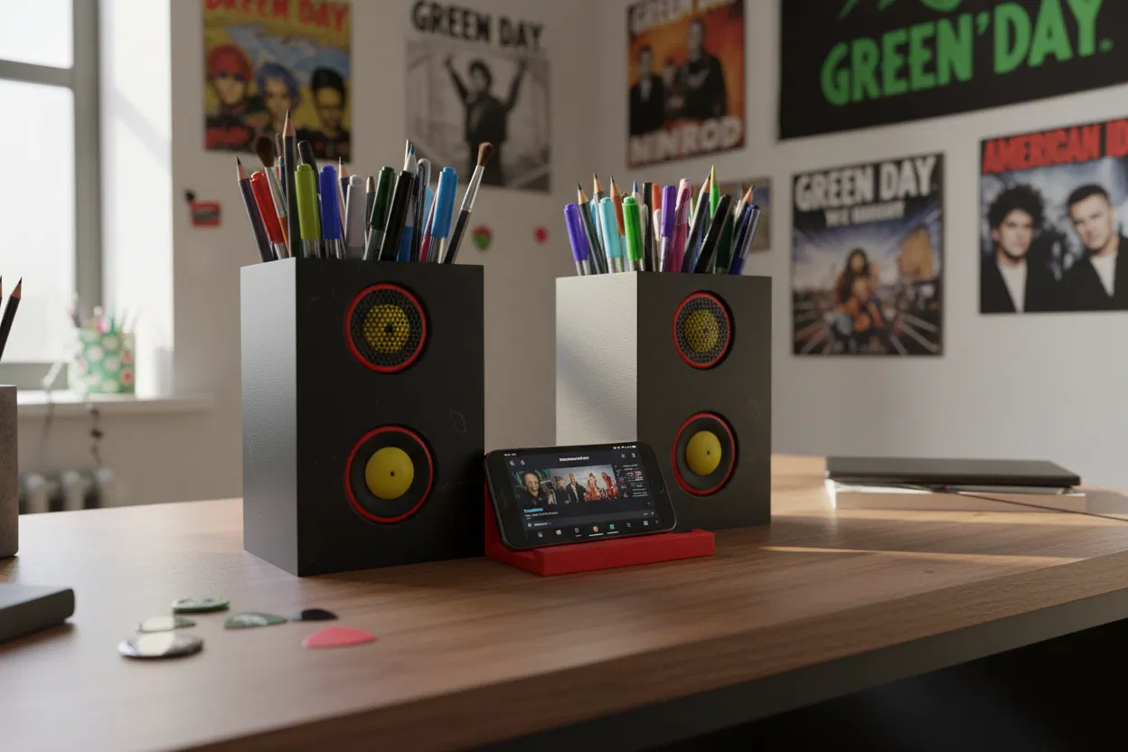 Nếu góc làm việc của bạn đang hơi bừa bộn và bạn muốn tìm kiếm một món đồ trang trí vừa tiện lợi lại vừa mang phong cách cá tính, thì mô hình ống cắm bút kết hợp giá đỡ điện thoại thiết kế theo kiểu loa thùng này chắc chắn là dành cho bạn. Thay vì sử dụng những khay đựng văn phòng phẩm nhàm chán thông thường, việc kết hợp bộ ống cắm bút mô phỏng dàn loa mini sẽ tạo ra điểm nhấn thị giác cực kỳ thú vị, giúp bàn làm việc của bạn trông hiện đại và chuyên nghiệp hơn hẳn.