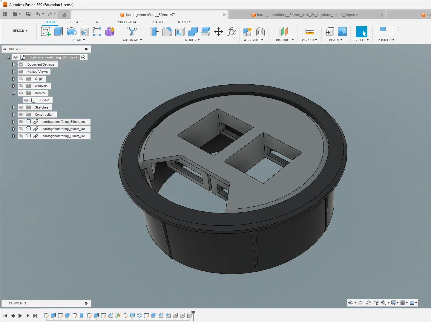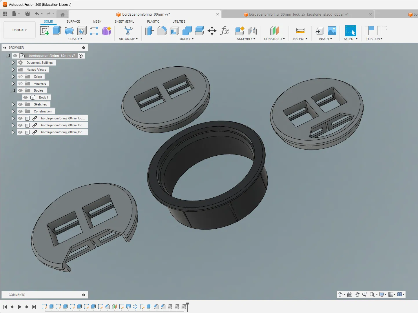 Chặn dây bàn đường kính 60mm (cho mặt bàn dày 22mm) với các nắp rời hỗ trợ lắp 2 module keystone. Thiết kế chắc chắn, dễ in, đi kèm cả file Fusion 360 để tùy chỉnh. Đã cập nhật thêm phiên bản cho lỗ 50mm.