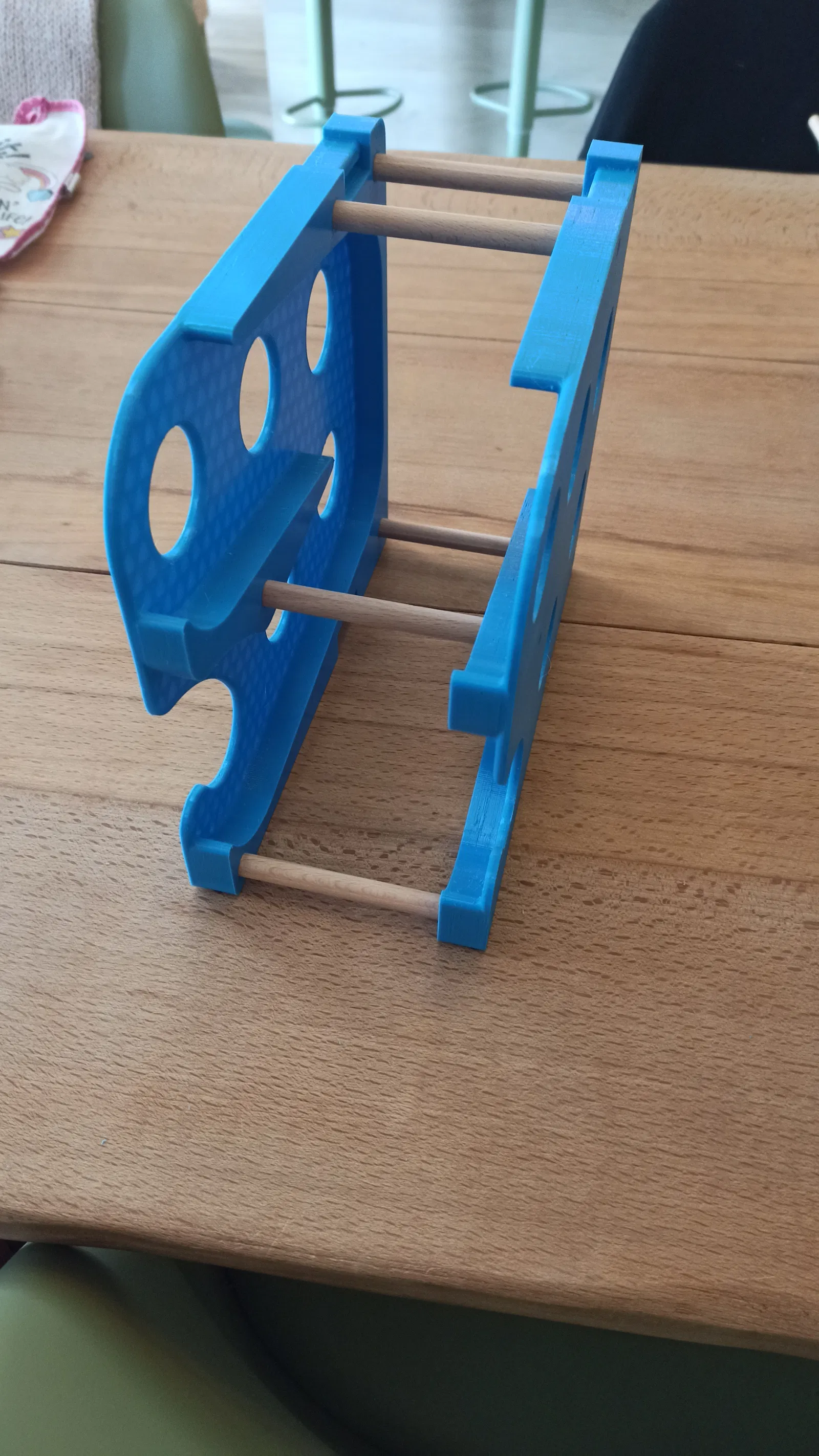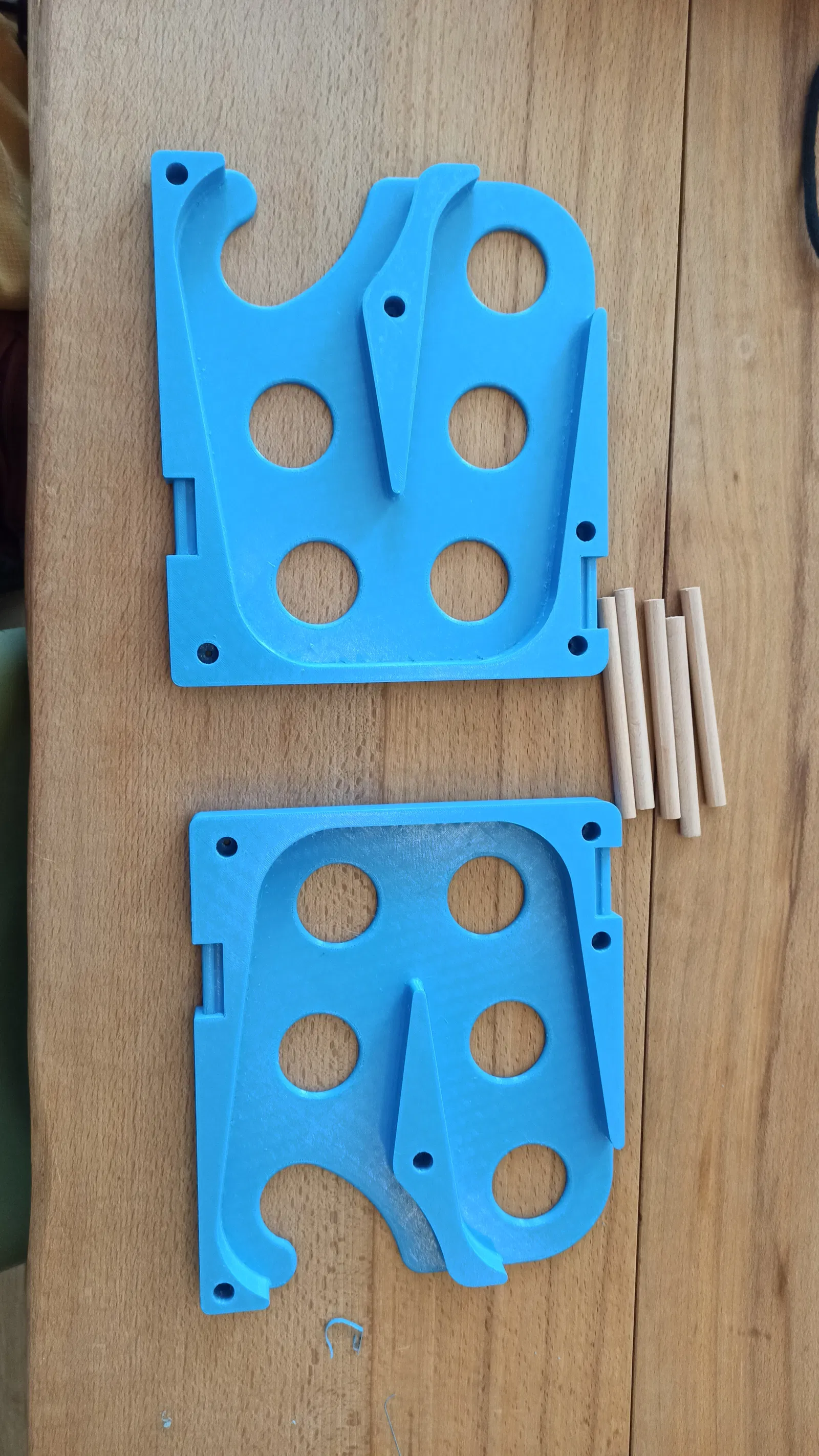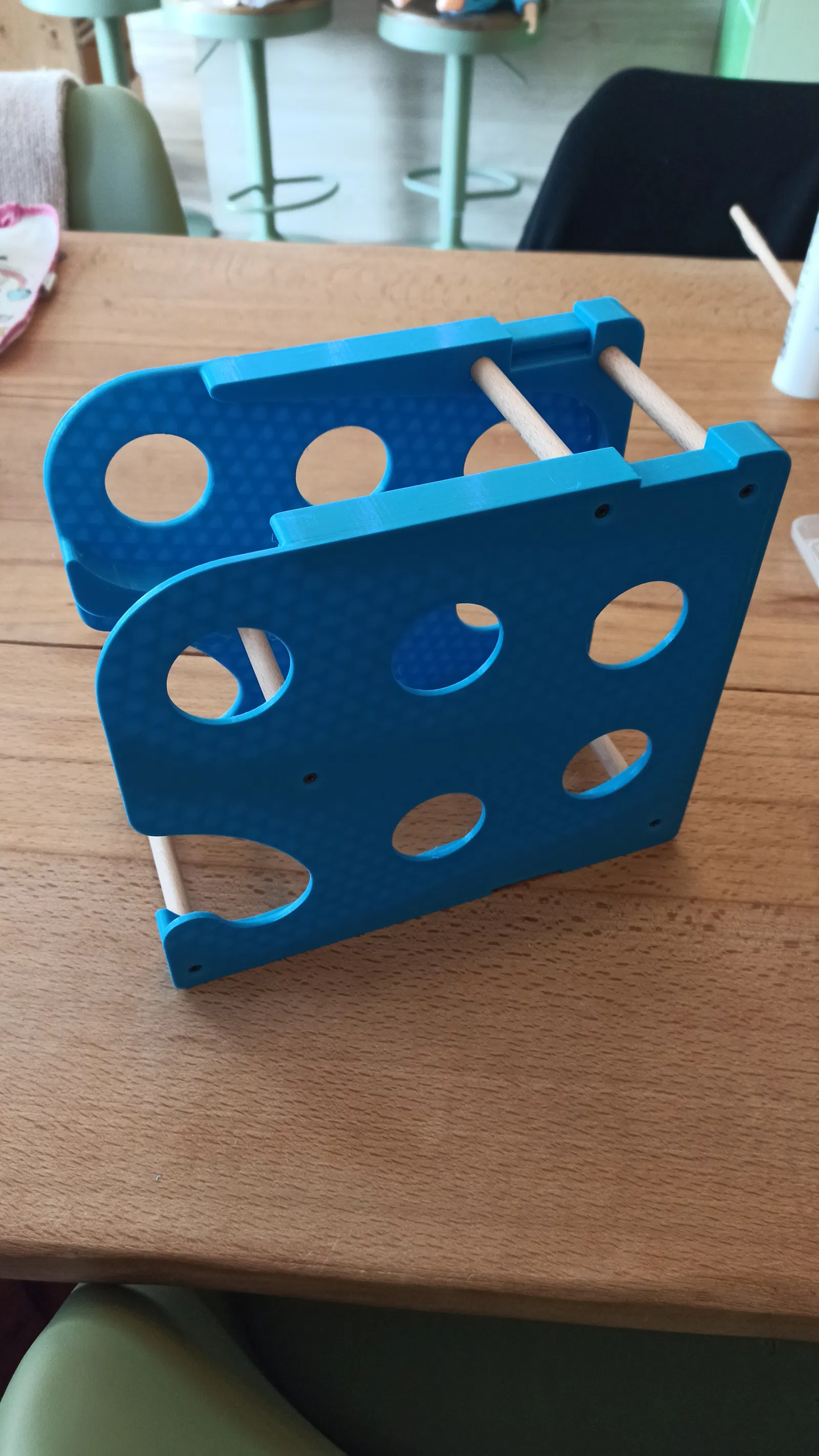 Để lắp ráp, bạn cần cắt 5 đoạn từ một thanh gỗ tròn đường kính 10mm (D10mm). Các đoạn gỗ này nên dài hơn lon bạn muốn chứa khoảng 1 đến 2mm. Cố định toàn bộ các thanh bằng 10 chiếc vít gỗ.