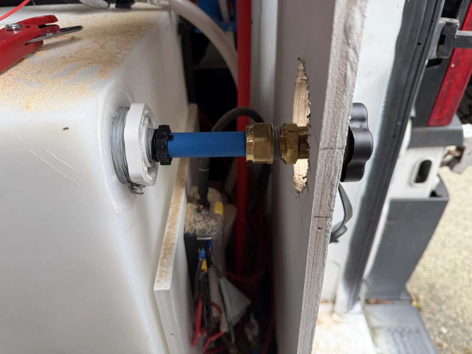 Mình vừa thay cái cổng cấp nước trọng lực (gravity fill inlet) trên xe van bằng một cổng cấp nước trực tiếp (city water inlet) mới, nên cần làm một cái mặt nạ (faceplate) để che đi cái lỗ cũ kích thước lớn hơn.