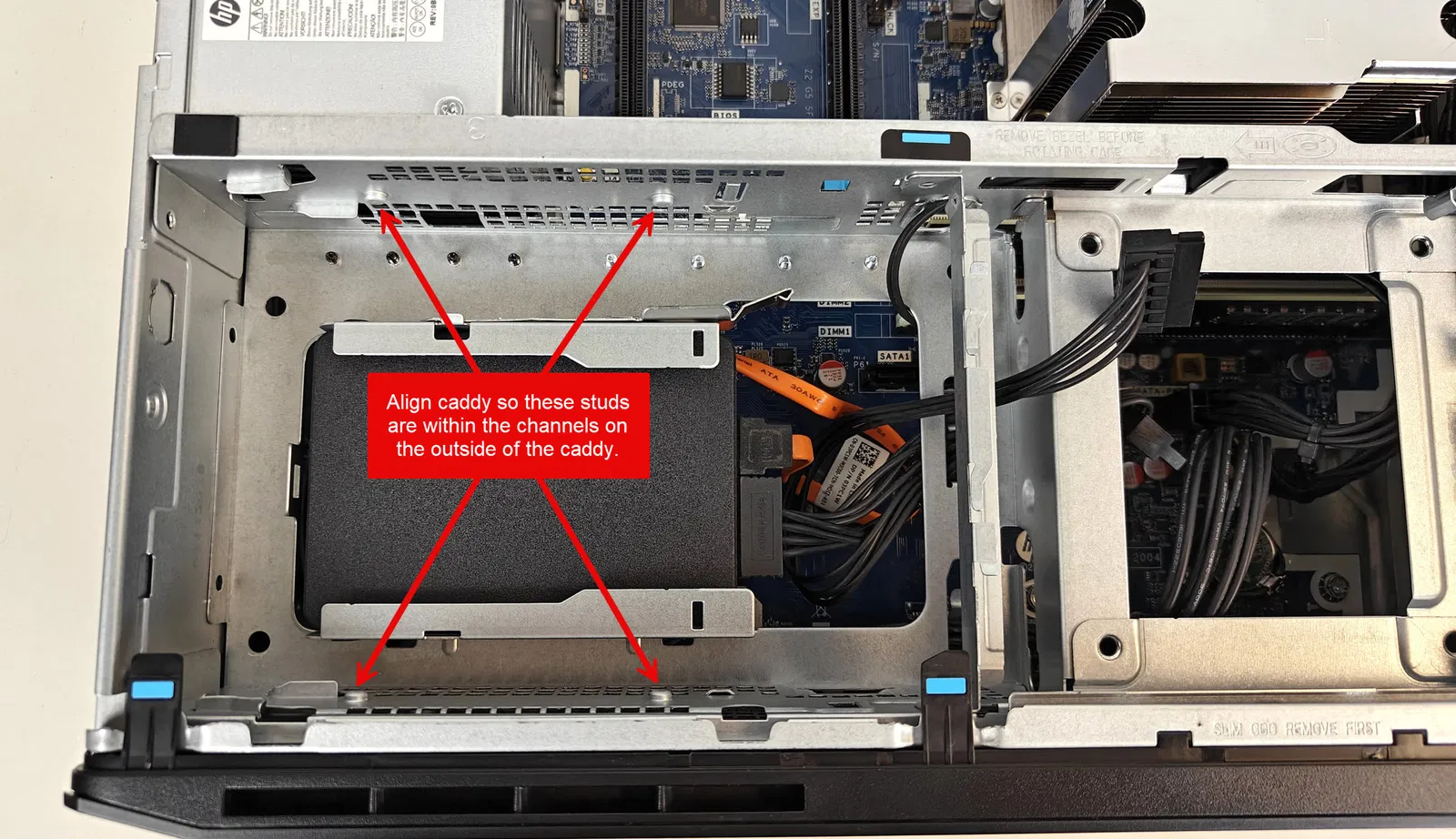 - Căn chỉnh các rãnh ở vách ngoài của khay khớp với 4 chốt trong khoang ổ đĩa, sau đó trượt khay xuống cho đến khi kịch vị trí.