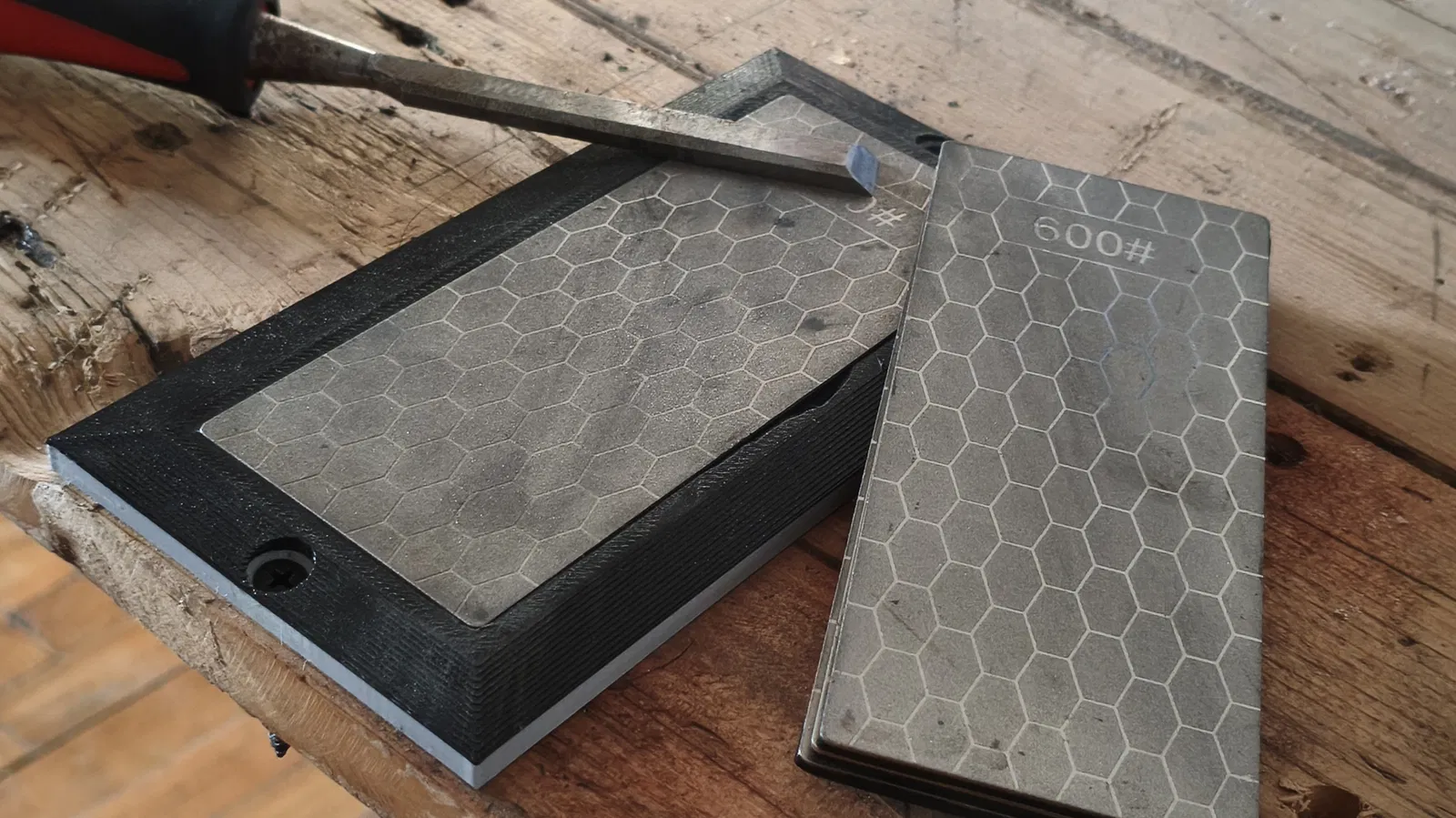 Đây là mẫu đế giữ đơn giản cho các loại đá mài kim cương có mặt lưng bằng mút (foam) giá rẻ từ Trung Quốc. Các tấm đá mài vừa với đế này nên có kích thước là 63 x 151 mm.