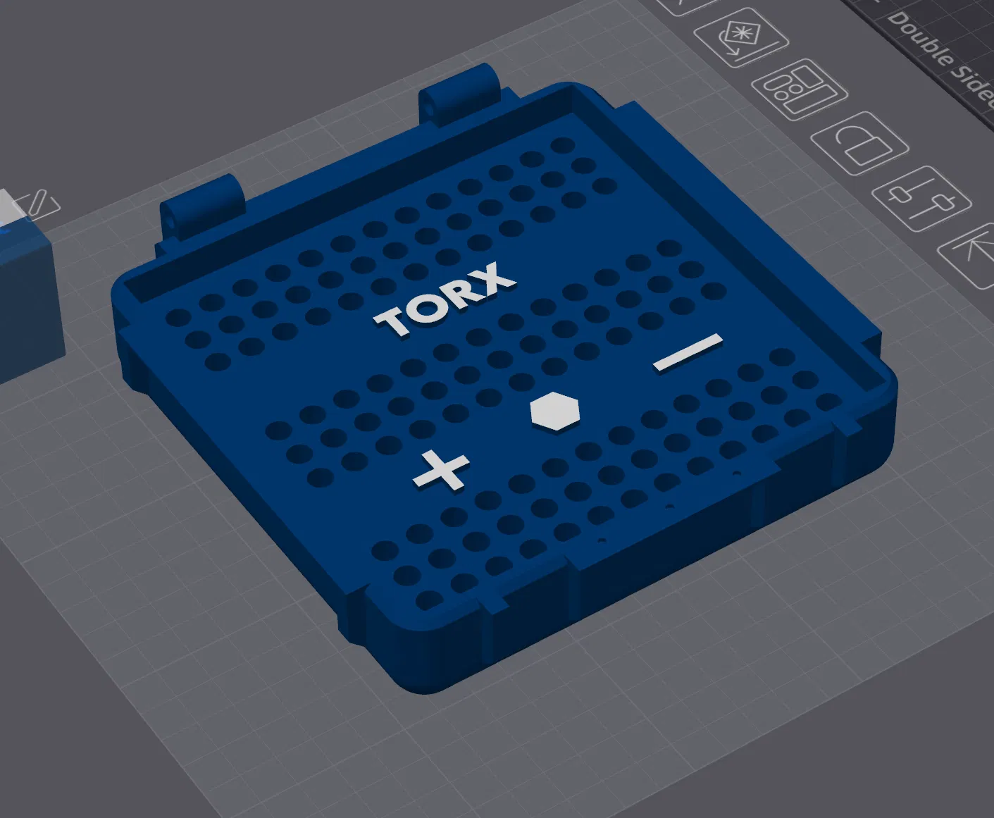 Hộp đựng nhỏ gọn cho các loại đầu vít Torx với phần ghi chú được tích hợp ngay trên nắp. Được thiết kế để sắp xếp ngăn nắp và dễ dàng lấy sử dụng trong xưởng hoặc hộp đồ nghề của bạn. Các đầu vít được giữ cố định trong các lỗ khoan vừa vặn, đảm bảo luôn nằm đúng vị trí. Nắp gập giúp bảo vệ khỏi việc rơi rớt và giữ cho đồ dùng luôn sạch sẽ khi di chuyển. CẬP NHẬT!!! Đã mở rộng lỗ từ 6,8cm lên 7,2cm để vừa với tất cả các loại đầu vít. Đặc điểm: – Thiết kế nhỏ gọn – Nắp gập có bản lề – Các lỗ cắm đầu vít – Ký hiệu TORX nổi – Đánh dấu Cộng / Trừ để dễ nhận biết. Phù hợp cho: – Các loại đầu vít 1/4" tiêu chuẩn – Xưởng cơ khí – Công việc kỹ thuật – Hộp đồ nghề. Khuyến nghị in ấn: – Độ cao lớp in 0,2 mm – 3–4 đường bao (perimeters) – Infill 20–30% – Khuyên dùng nhựa PETG để tăng độ bền – In riêng phần nắp và thân hộp. Có thể cố định trục bản lề bằng chốt kim loại hoặc một đoạn sợi nhựa. Lưu ý: Tùy vào nhà sản xuất mà kích thước đầu vít có thể chênh lệch đôi chút. Nếu thấy quá chặt, bạn có thể thử điều chỉnh tỉ lệ in lên 100,5%.