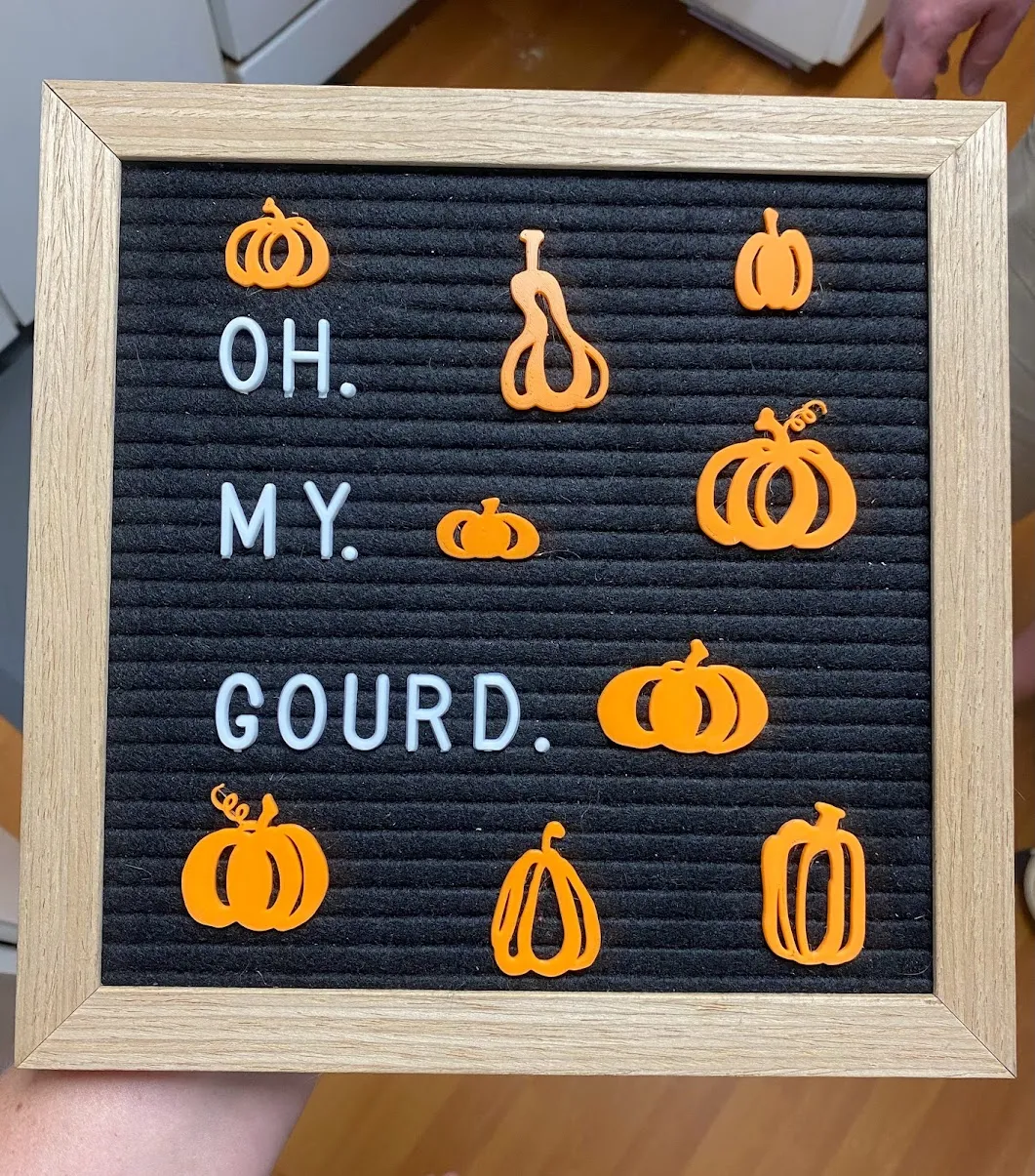 9 bí ngô hoặc bí ngô khác nhau, mỗi cái đều có một tab ở phía sau phù hợp với bảng chữ cái. In tất cả cùng một lúc hoặc từng cái một. Bạn cũng có thể thay đổi kích thước chúng nhưng hãy nhớ rằng tab cũng sẽ thay đổi kích thước nếu bạn thay đổi thiết kế.