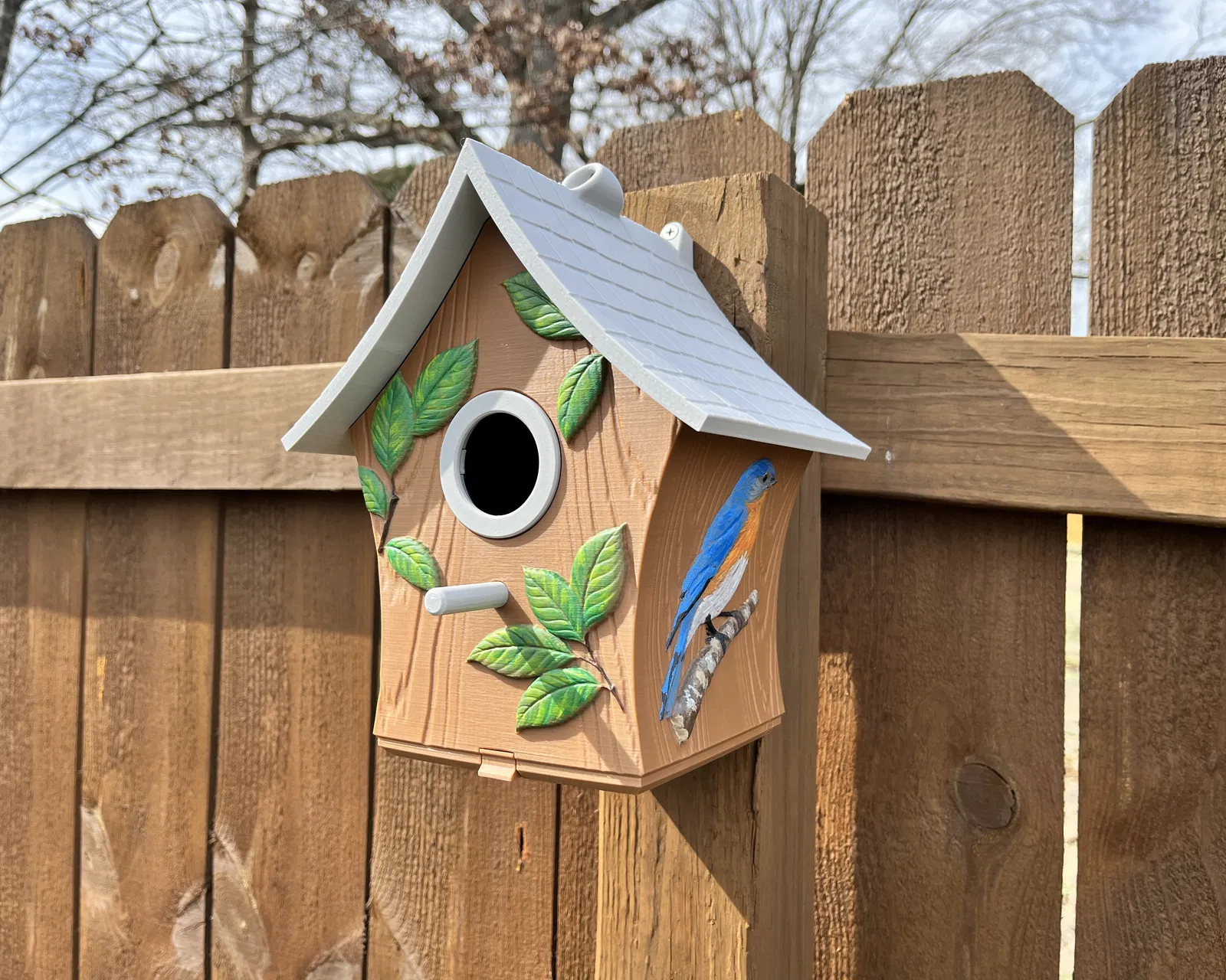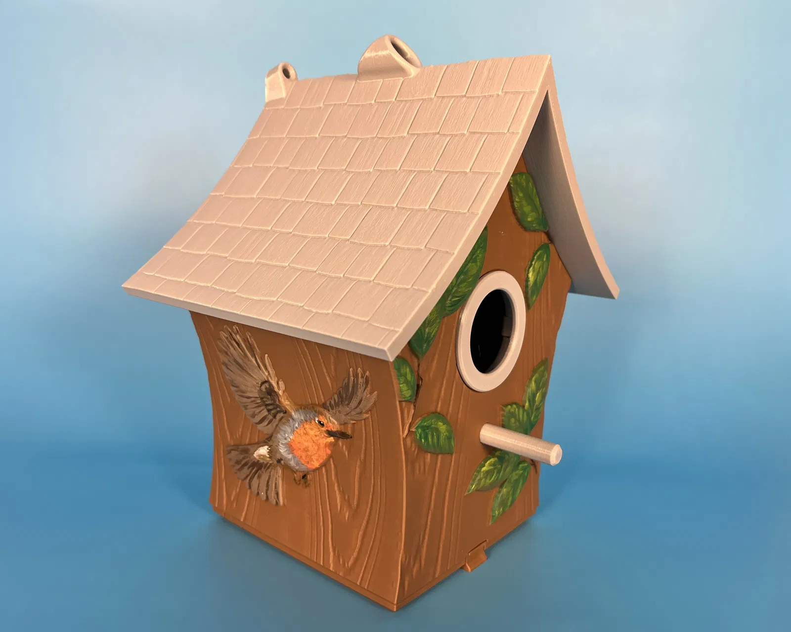 Mẫu nhà cho chim (Birdhouse) với thiết kế mộc mạc, có họa tiết lá và chim. Các bộ phận lắp ghép khớp nối không cần dùng keo. Có cửa vệ sinh tiện lợi, hỗ trợ treo hoặc gắn trụ. Khuyên dùng nhựa PETG để chịu thời tiết tốt nhất.