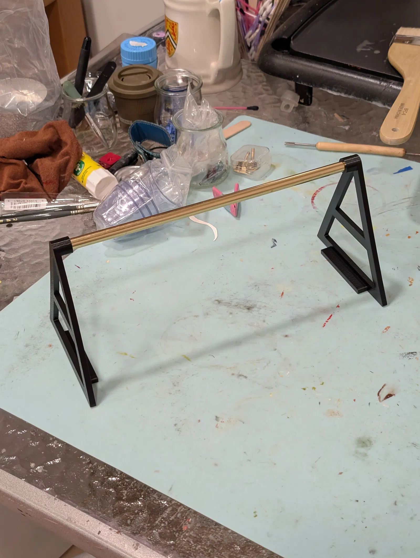 Một thanh kim loại kích thước 3/8 inch sẽ vừa khít với các lỗ lắp. Nếu hơi lỏng, bạn có thể dùng thêm keo. Nếu hơi chặt, hãy hơ nóng thanh kim loại rồi ấn vào để nó tự tạo rãnh. Cửa hàng kim khí gần nhà bạn chắc chắn có bán loại thanh này. Mình dùng đồng thau, nhưng bạn có thể dùng nhôm, thép, hay thậm chí là thanh ren cũng được.