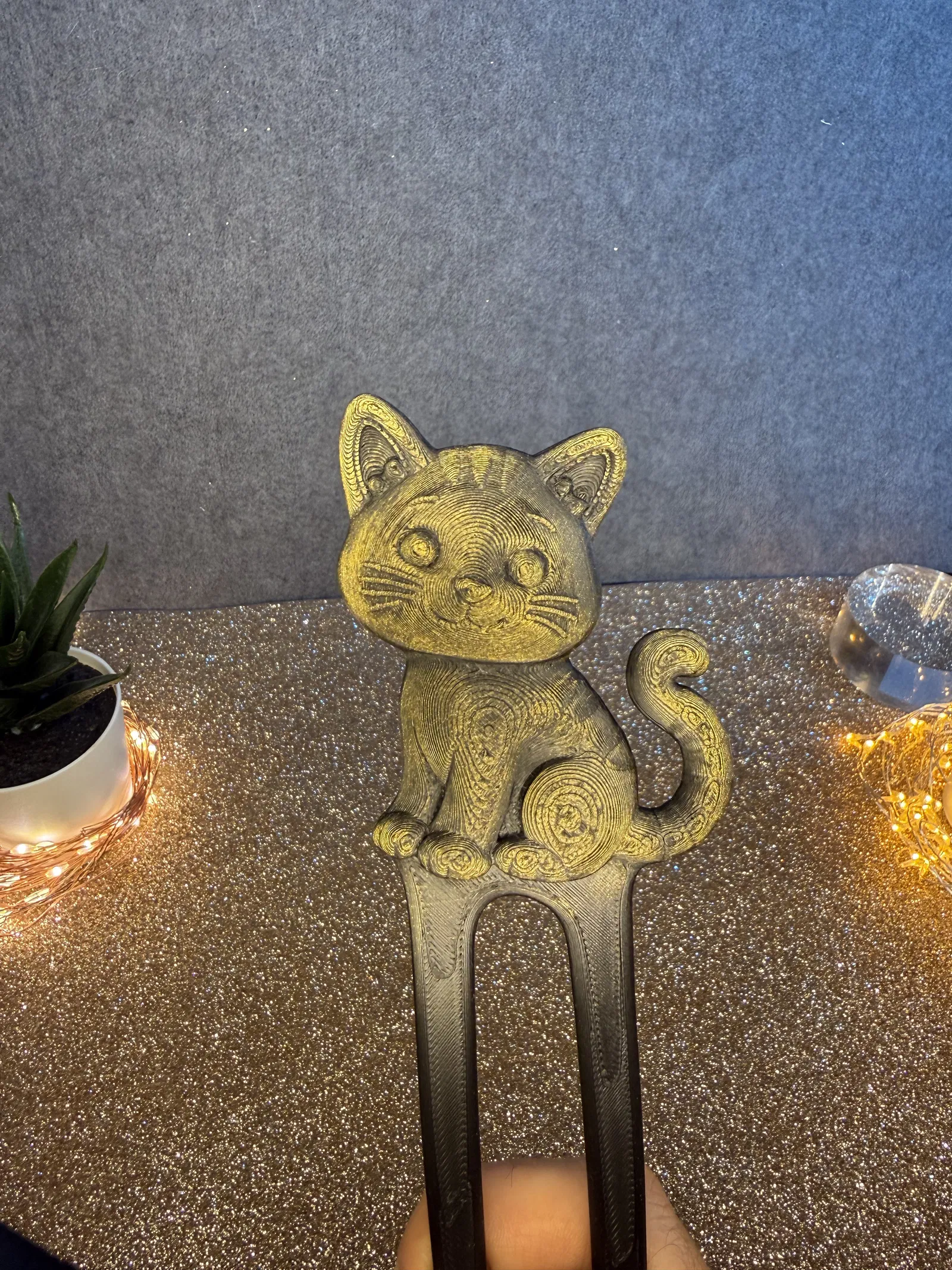 Phần đế của chú mèo được tích hợp sẵn giá đỡ để gắn thun buộc tóc, biến sợi thun bình thường thành một món phụ kiện trang trí bắt mắt. Thiết kế này đảm bảo được độ bền cơ học tốt nhưng vẫn giữ được trọng lượng nhẹ, giúp bạn thoải mái đeo cả ngày mà không bị nặng đầu.