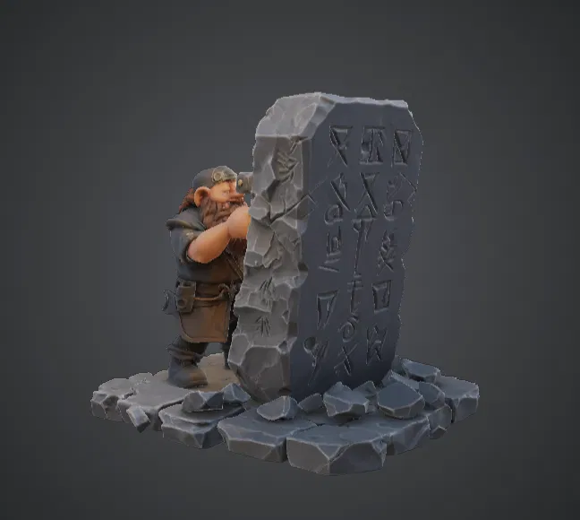 Thiết kế của mô hình mang đậm phong cách người lùn cổ điển, bao gồm bộ râu tết bện, trang phục lao động gai góc và đôi ủng chắc chắn, rất phù hợp cho cuộc sống trong các sảnh đường núi hoặc những lò rèn dưới lòng đất. Tảng đá rune lớn được bao phủ bởi các biểu tượng chạm khắc trở thành tâm điểm của tác phẩm, trong khi những mảnh đá vụn dưới chân giúp tăng thêm tính chân thực và tính kể chuyện cho mô hình.