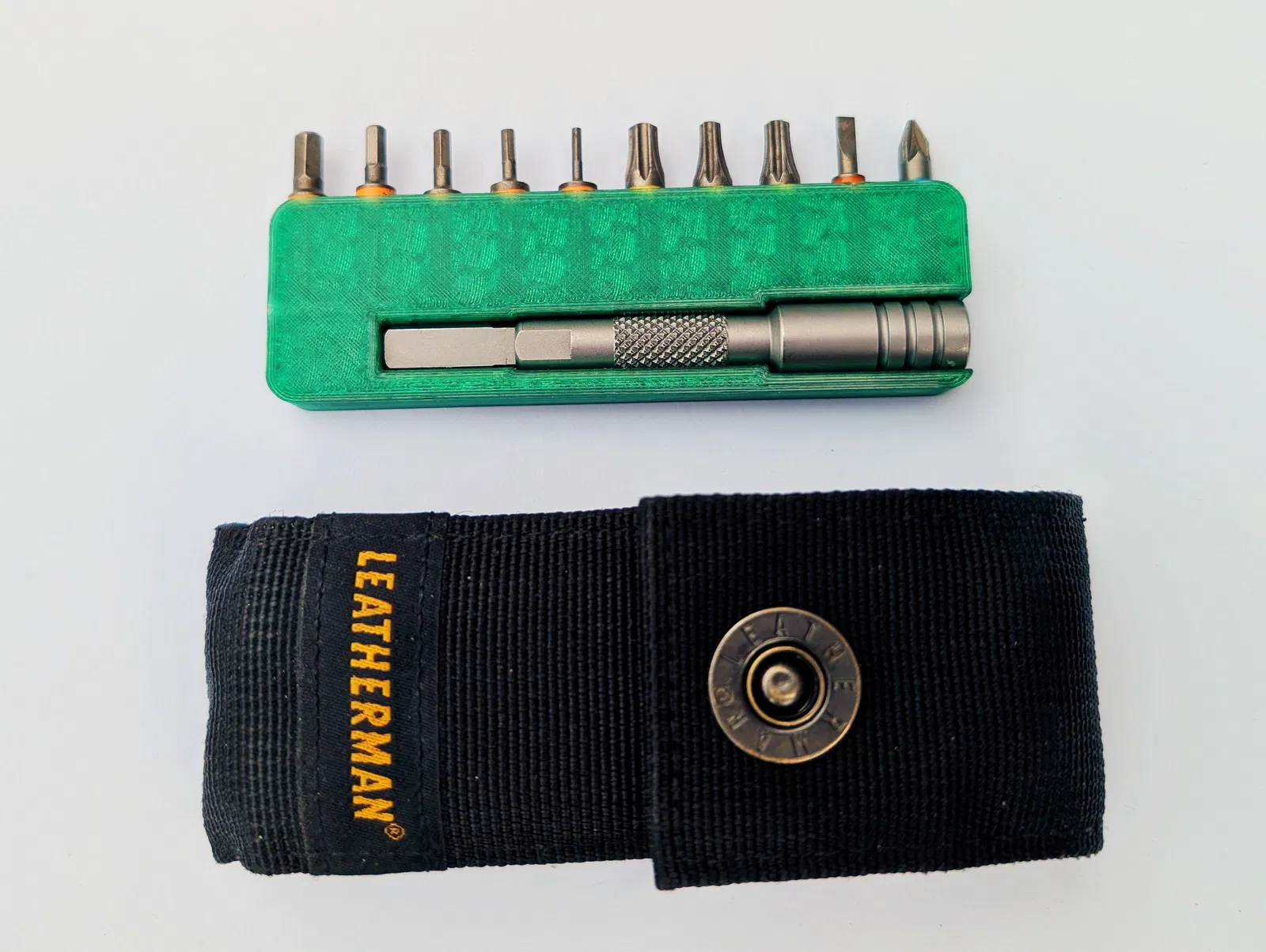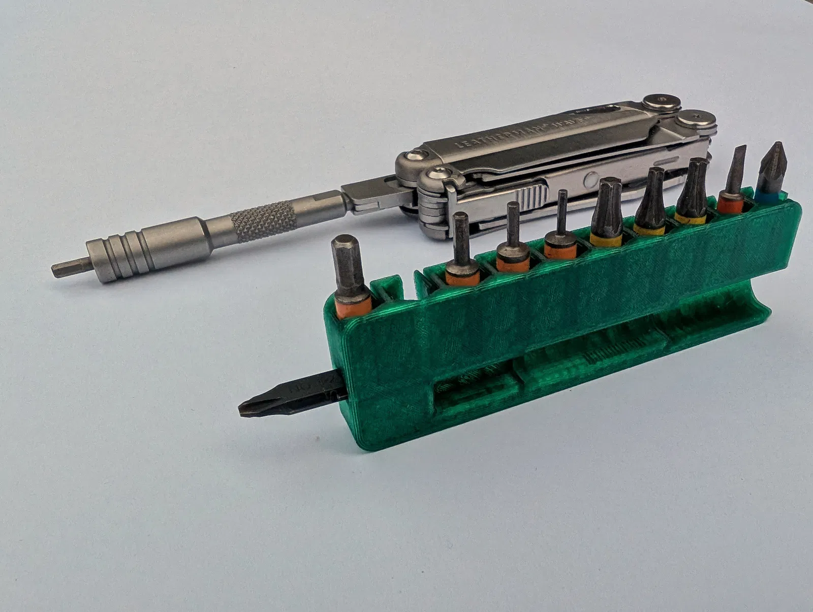 Dụng cụ tiện lợi giúp giữ 10 đầu bit tiêu chuẩn cùng thanh nối dài của Leatherman. Thiết kế thông minh, không cần hỗ trợ khi in, tương thích tốt với chất liệu in 3D như PLA hoặc PETG để tăng độ bền cho sản phẩm.