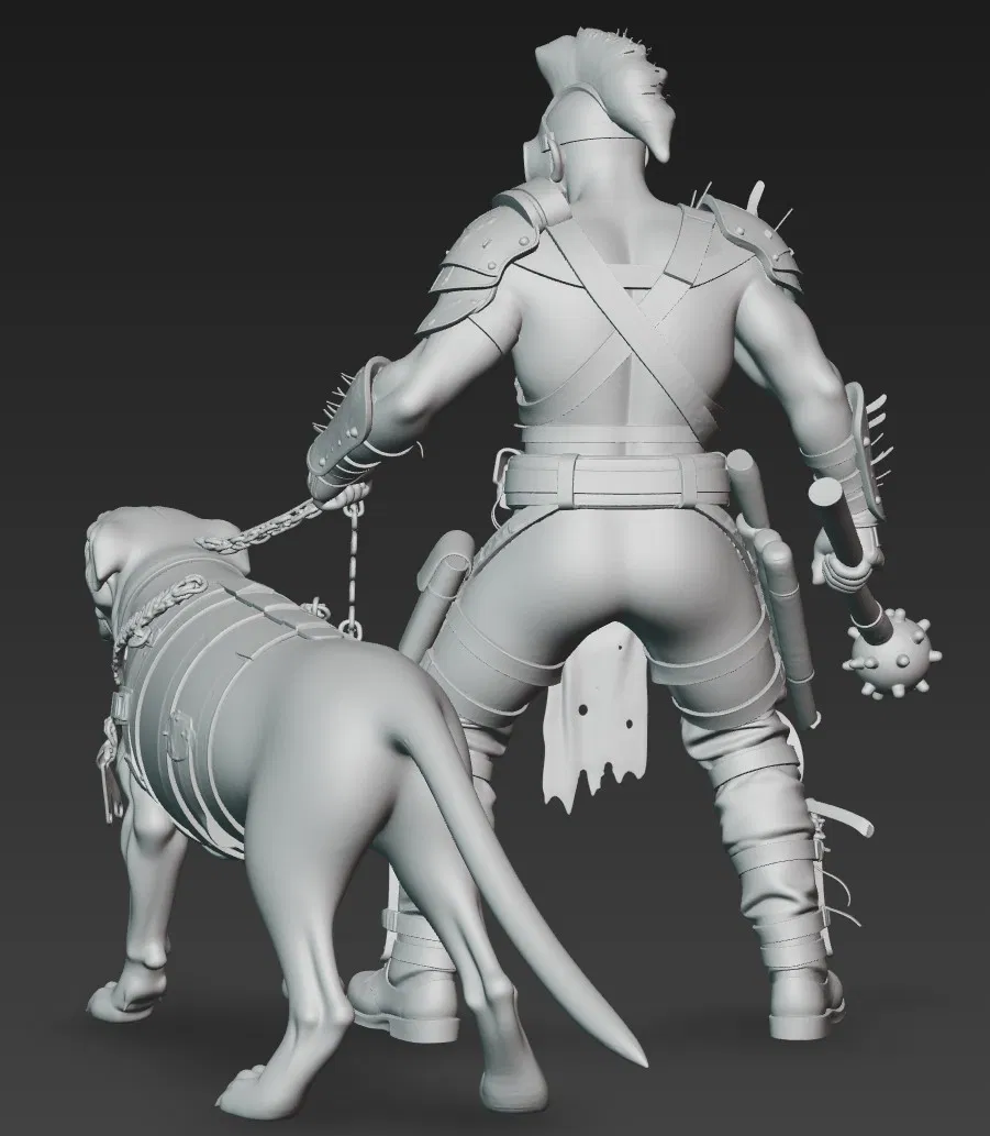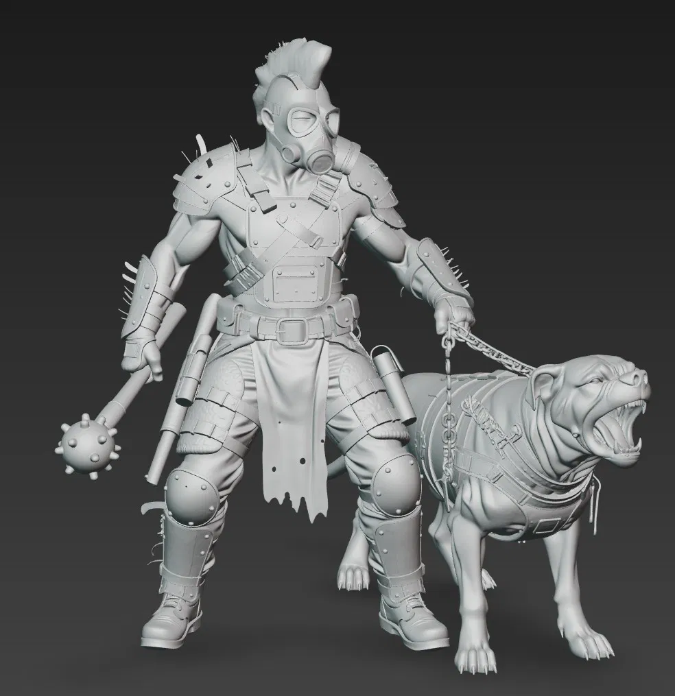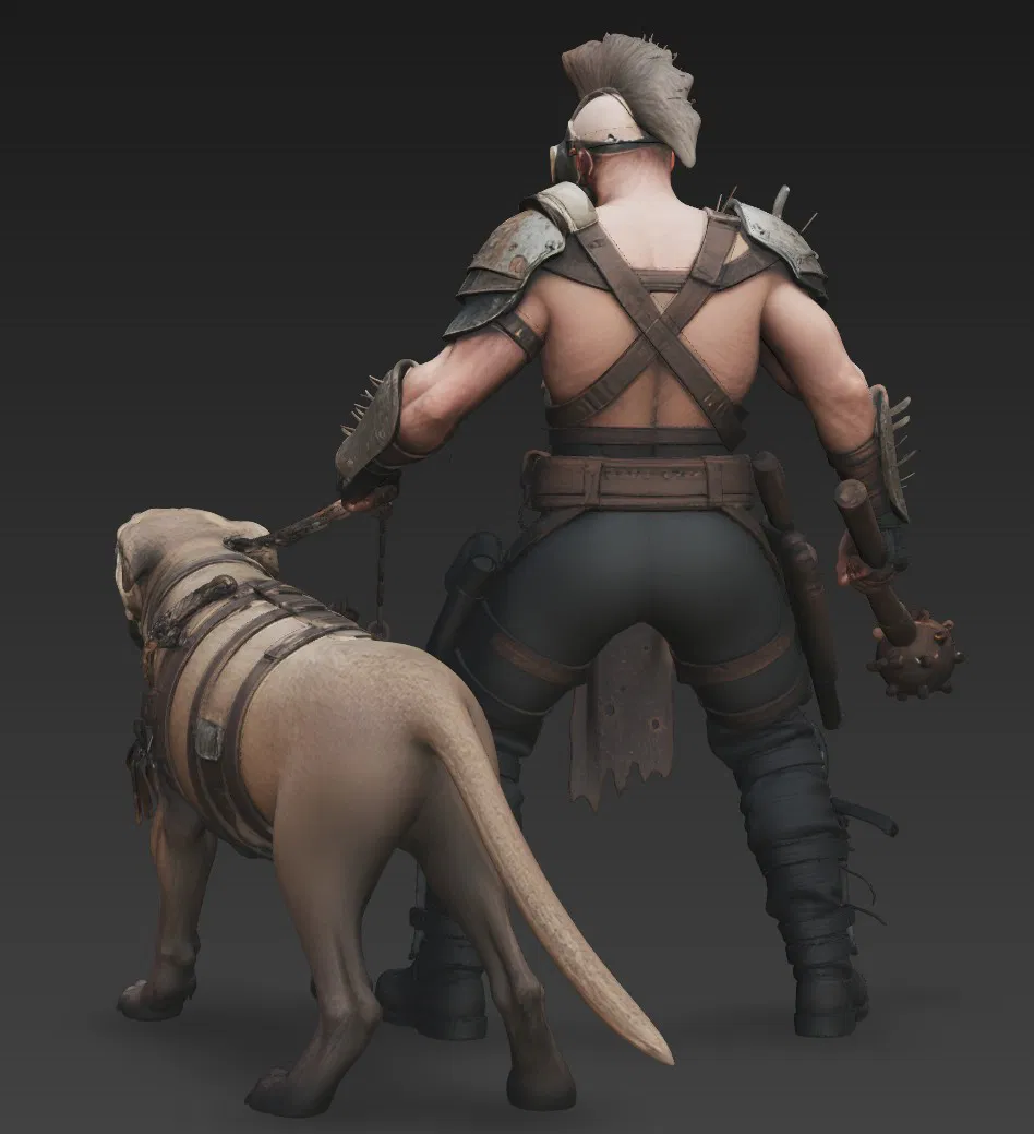 Mô hình 3D chiến binh hậu tận thế và chó chiến phong cách Mad Max