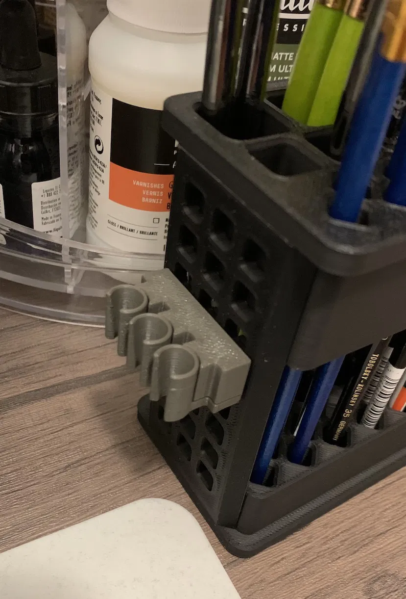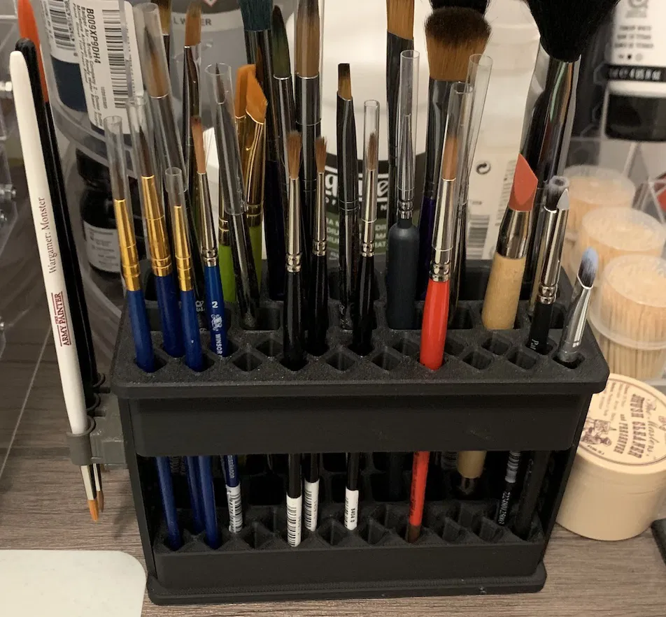 Đây là một phụ kiện nhỏ gọn giúp bạn làm khô cọ vẽ mô hình bằng cách treo ngược đầu cọ xuống. Sản phẩm được thiết kế để kết hợp hoàn hảo với mẫu thiết kế trước đó của mình là và không chiếm thêm diện tích đáng kể. Phụ kiện này phù hợp với hầu hết các loại cọ cỡ trung bình (lỗ treo có thể tùy chỉnh kích thước từ 5mm đến 8mm). Đối với cọ lớn hơn size 6, khả năng cao là sẽ không vừa trừ khi cán cọ của bạn rất mảnh. Một vài loại cọ R&L của mình vì cán quá nhỏ nên vẫn có thể bị trượt qua lỗ treo này.