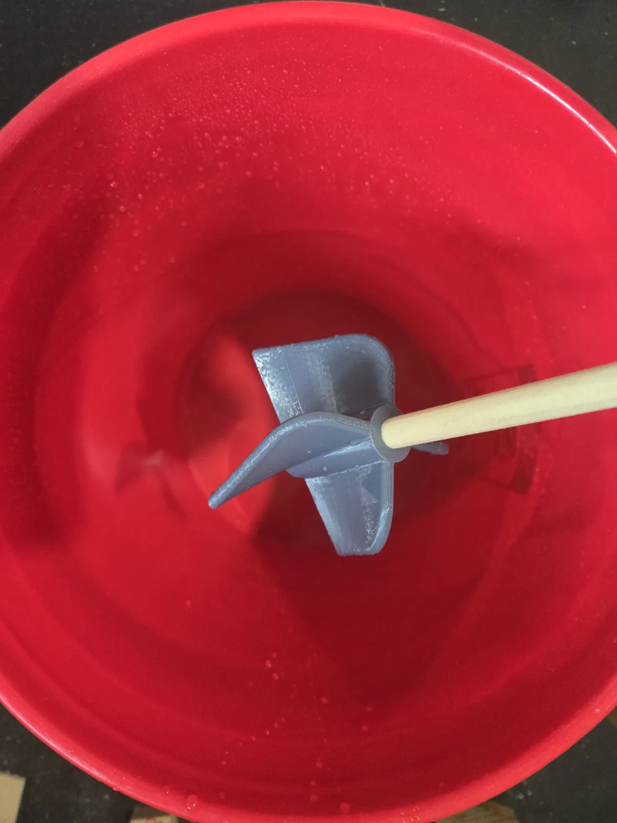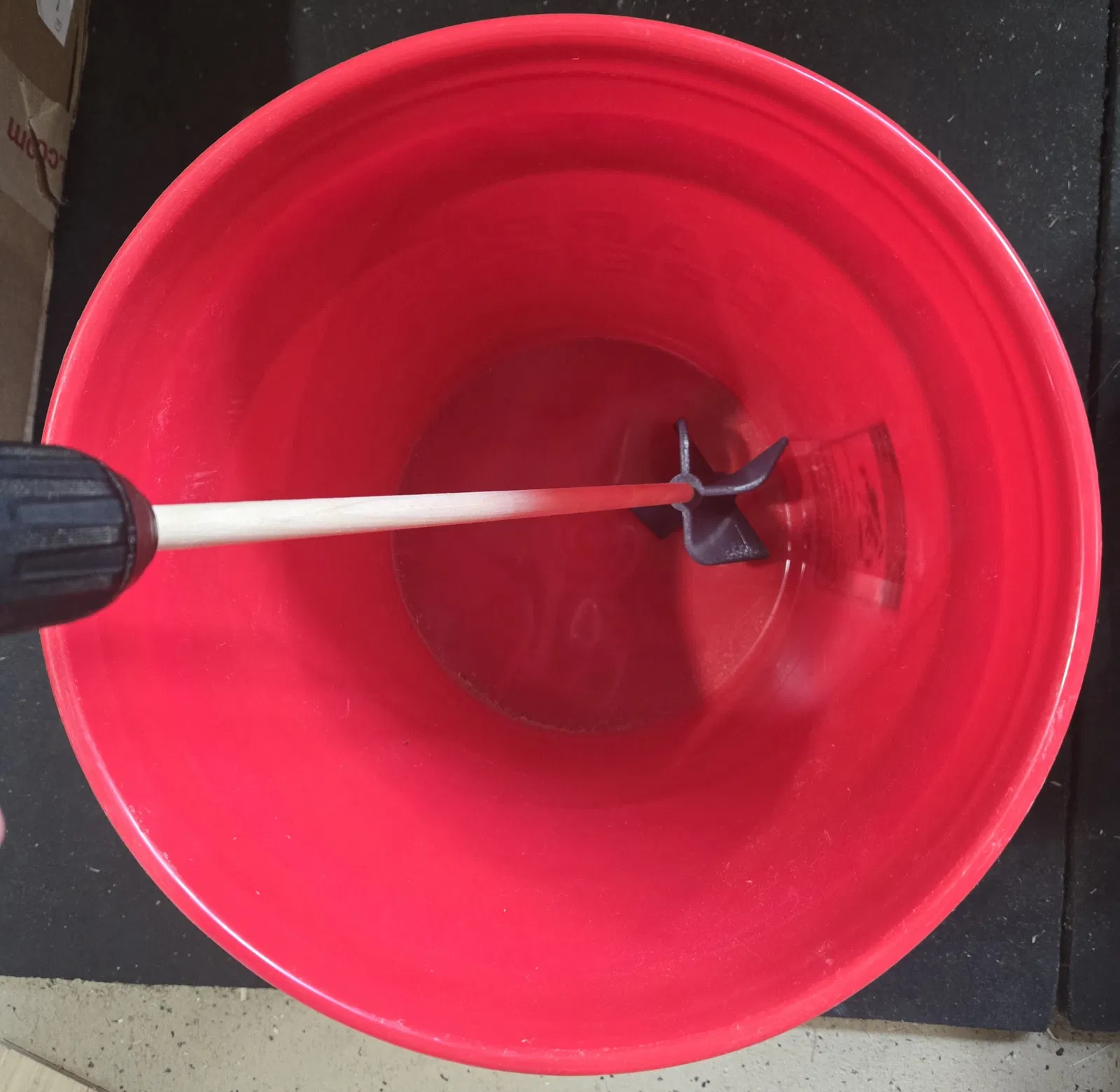 Mọi người nhớ ráng tìm cây gỗ tròn (dowel) thẳng nhất có thể ở cửa hàng kim khí nha, mình thì cắt khúc tầm 18 inch (khoảng 45cm) để trộn xô 5 gallon chuẩn. Việc ép chặt (press-fit) cây gỗ vào đầu trộn là đủ dùng cho các loại hỗn hợp gốc nước, nhưng nếu muốn chắc chắn hơn thì anh em có thể dán keo lại. Để tăng độ bền và chống chịu hóa chất tốt hơn, anh em có thể quét thêm một lớp epoxy hoặc dùng các loại chất phủ bảo vệ tùy thích cho cây gỗ.