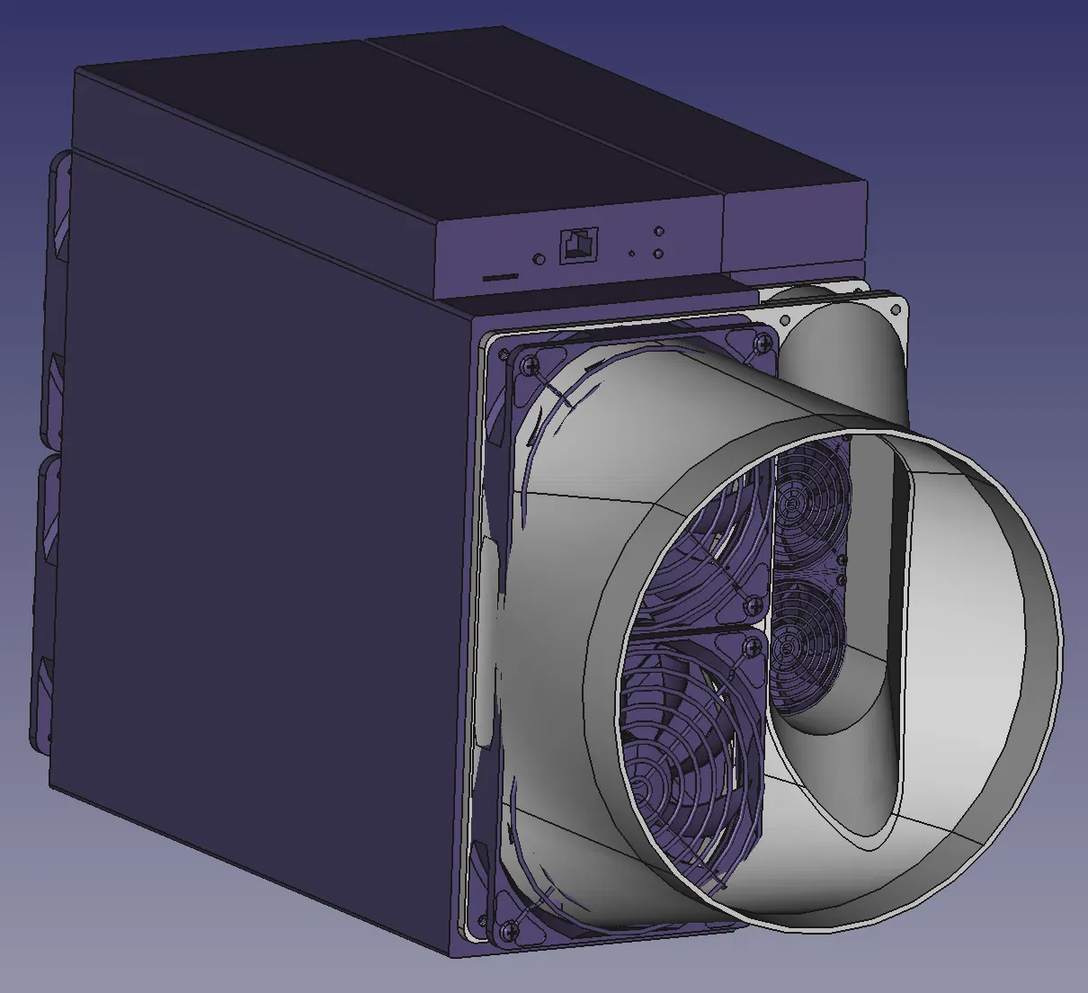CHƯA ĐƯỢC KIỂM CHỨNG: Thiết kế này mới chỉ được mô phỏng trên máy tính và chưa được in thử nghiệm trực tiếp trên Antminer S19 Pro. Vui lòng cân nhắc kỹ khi sử dụng.