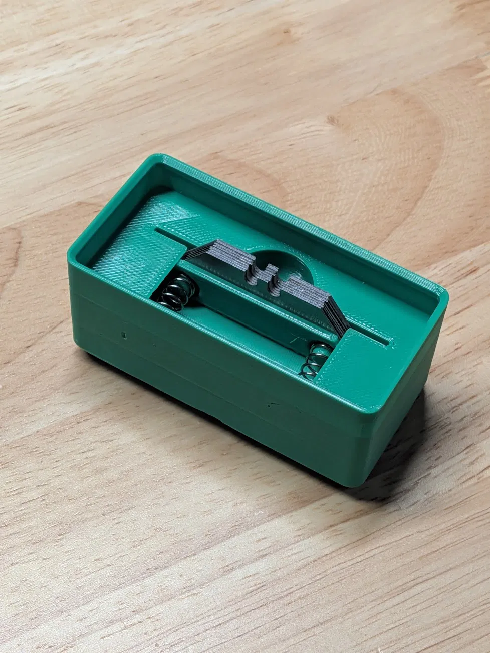 Bản remix từ khay đựng lưỡi dao Gridfinity của Shorco với chiều cao 5U cho phép xếp chồng. Thiết kế này bổ sung thêm tấm đế in liền để giữ lò xo chắc chắn, ngăn tình trạng lò xo bị bung ra khi lấy lưỡi dao cuối cùng.