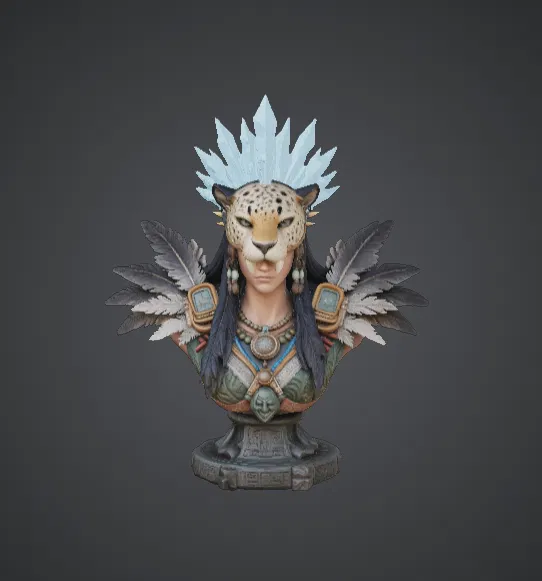 Mô hình Tượng Bán Thân Nữ Tư Tế Báo Đốm này đại diện cho một thủ lĩnh tâm linh đầy quyền năng, gắn liền với các truyền thống bộ lạc cổ xưa và linh hồn động vật. Với chiếc mặt nạ báo đốm ấn tượng và vương miện kết từ những chiếc lông vũ pha lê, vị nữ tư tế toát lên vẻ mạnh mẽ và đầy huyền bí của rừng sâu. Đôi cánh lông vũ lớn trải rộng sau vai, cùng với trang sức tinh xảo và giáp phục nghi lễ trang trí trên phần ngực.