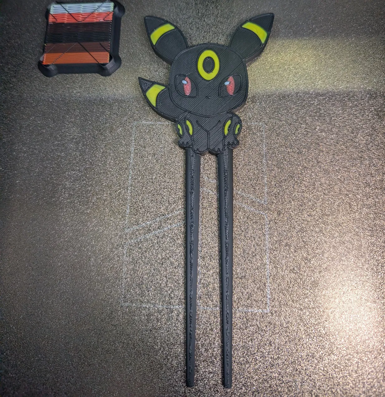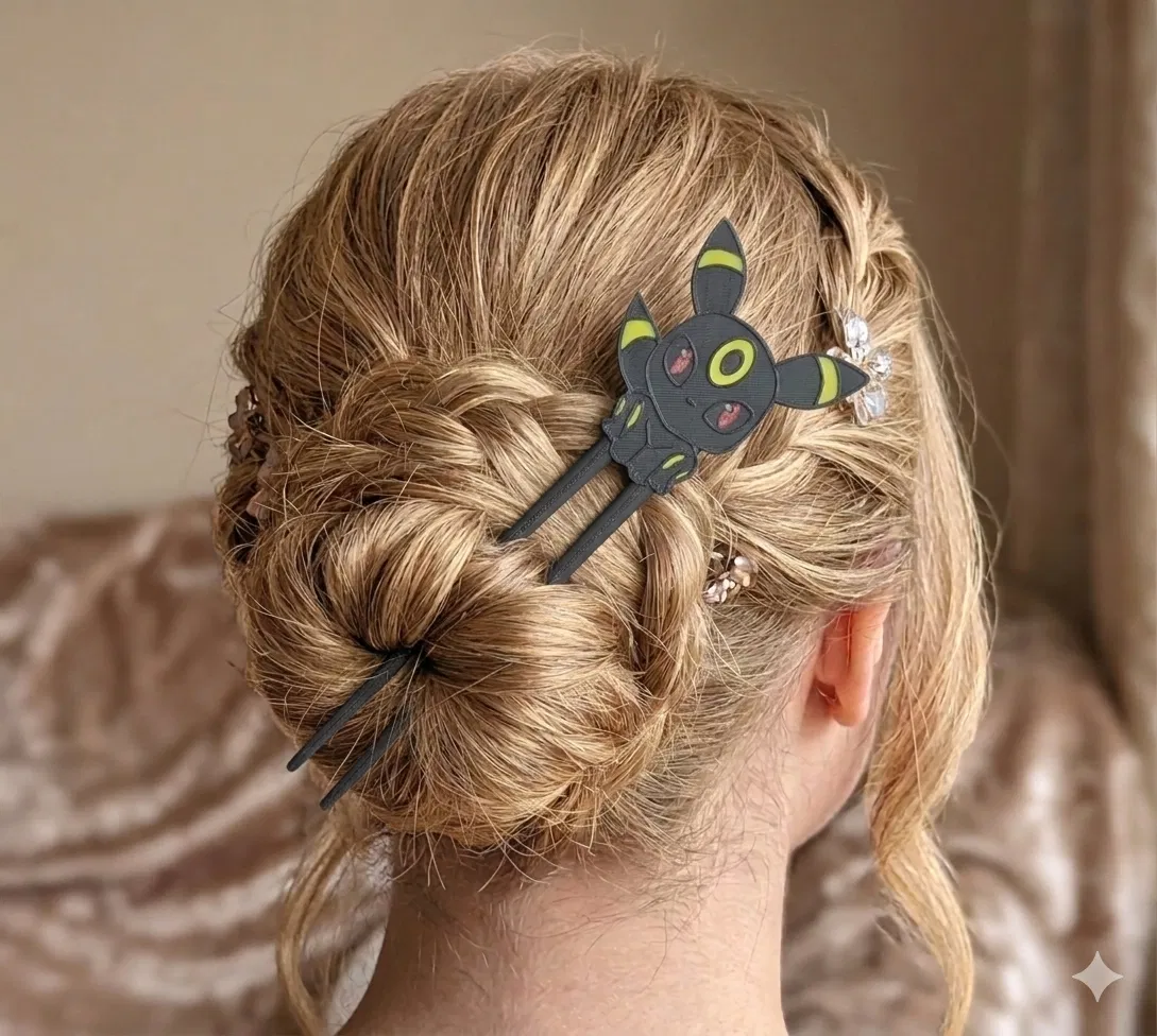 Mẫu kẹp tóc hoặc vật phẩm trang trí lấy cảm hứng từ Umbreon. Sản phẩm yêu cầu thay đổi 14 loại màu nhựa khác nhau, thời gian in khoảng hơn 1 tiếng với lớp in .16. Một phụ kiện xinh xắn và độc đáo dành cho các fan Pokémon.
