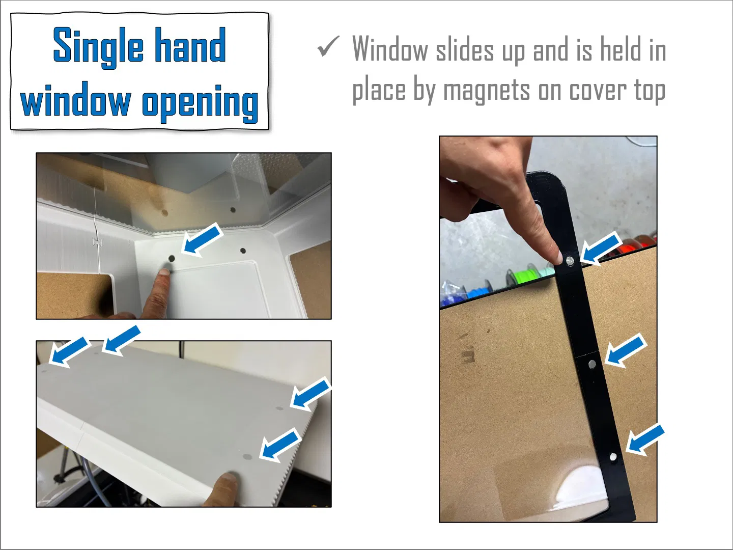 - Nam châm ở nắp trên giữ cửa sổ ở 2 vị trí khi mở mặt trước;