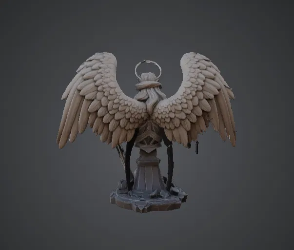 Thiết kế này sở hữu các chi tiết lông vũ được xếp lớp tuyệt đẹp, các mảnh giáp tinh tế cùng biểu cảm điềm tĩnh nhưng đầy uy quyền, lột tả được khí chất cao quý của một đấng bảo hộ thiên giới. Phần đế tượng cũng bao gồm các chi tiết trang trí tinh tế nhằm củng cố chủ đề thiên đàng của tác phẩm.