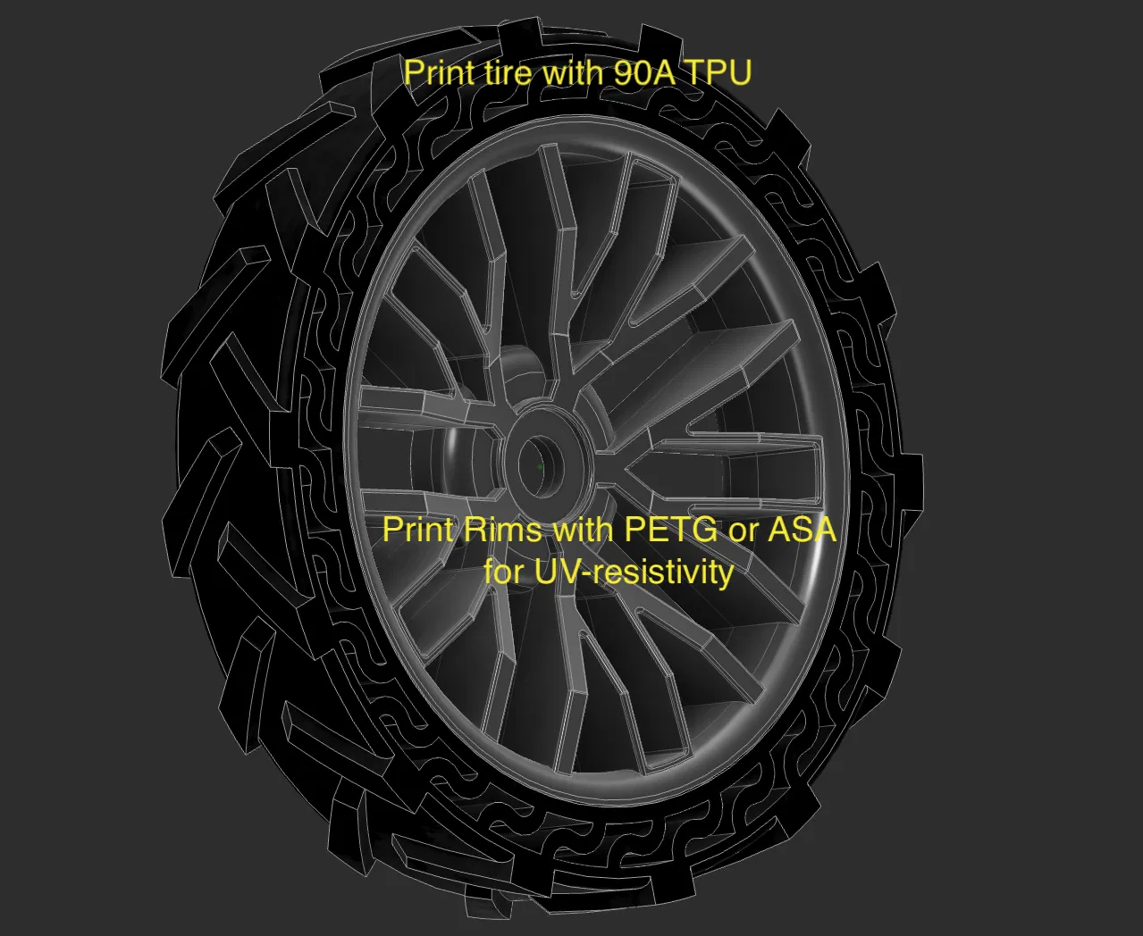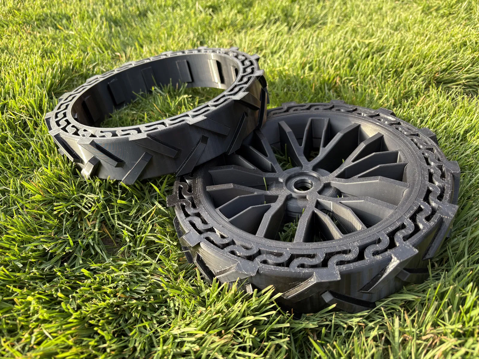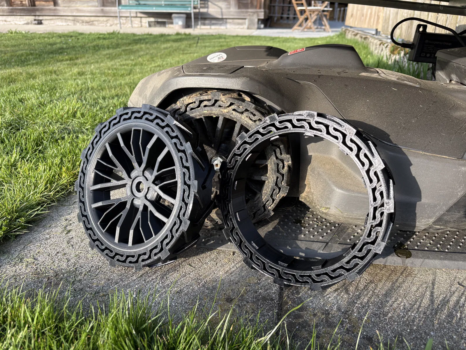 Sử dụng lốp in bằng nhựa TPU và bộ vành mới. Lốp mềm, có độ đàn hồi tốt giúp xe vận hành êm ái hơn trên bề mặt cứng, bảo vệ Automower khỏi rung chấn. Lốp được thiết kế rộng hơn so với bánh zin, đi kèm họa tiết gai lốp kiểu nông nghiệp nhìn cực kỳ cứng cáp và đẹp mắt. Hơn nữa, nhờ vào độ linh hoạt của lốp, tình trạng bám bẩn cũng giảm đi đáng kể.
