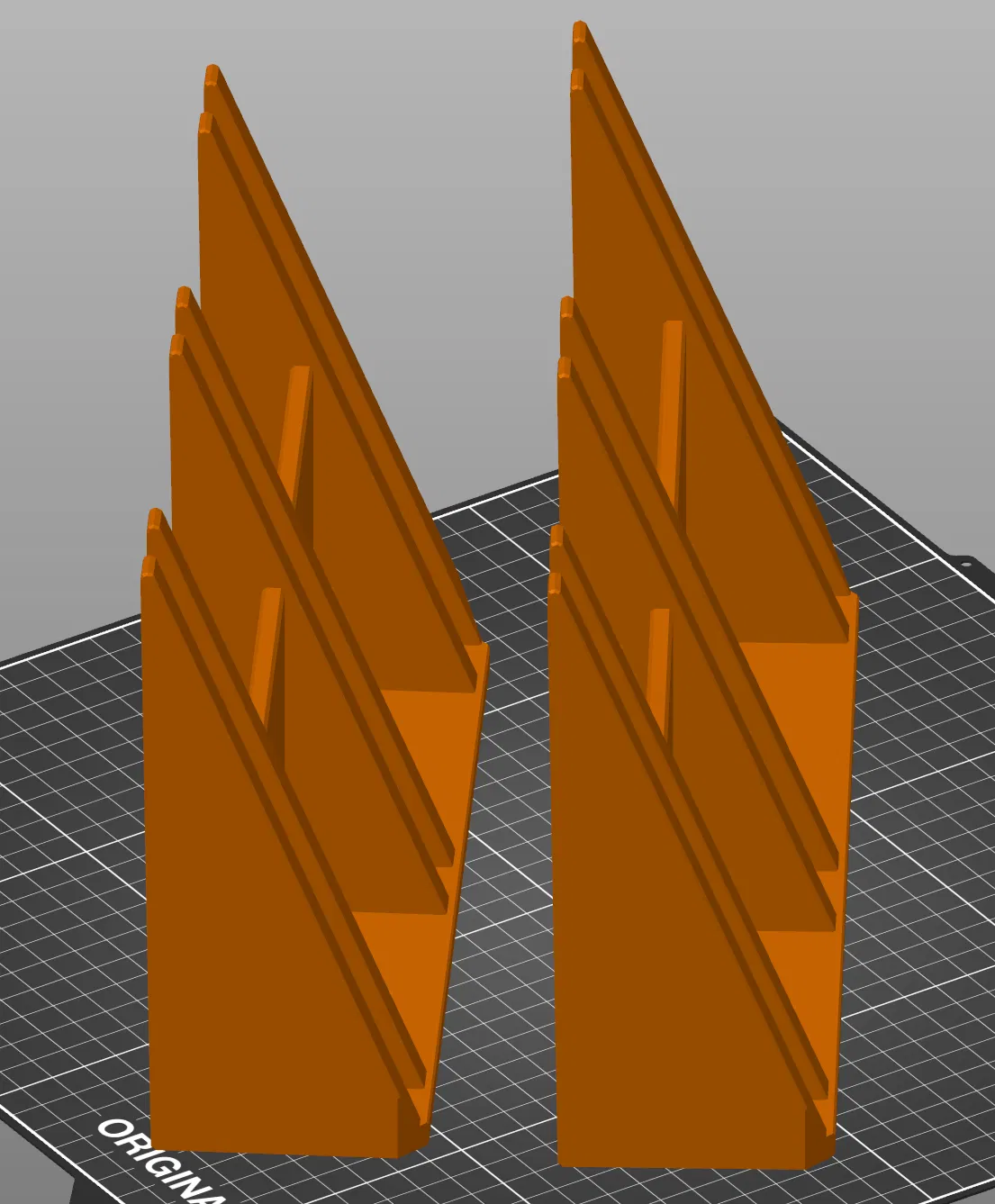 Việc treo kẹp Quick-Grip lên thanh khăn hoặc kẹp vào kệ rất bất tiện và chiếm diện tích, nên mình đã thiết kế những chiếc giá treo này. Các kẹp được giữ chắc chắn theo hàng 5 cái một, và bằng cách điều chỉnh độ mở của kẹp khác nhau, các tay cầm có thể xếp chồng lên nhau. Nhờ đó, mình có thể treo tới 15 cái kẹp trên mỗi giá. Một loại giá được thiết kế với ba khe cho bất kỳ sự kết hợp nào của kẹp 6" và 12" có độ sâu họng là 3". Loại còn lại có một khe ở giữa cho các loại kẹp 24" lớn hơn với độ sâu họng 3.5" và hai khe bên ngoài cho kẹp 6" và/hoặc 12". Như trong ảnh, mình có thể lưu trữ 30 chiếc kẹp chỉ trên 30 inch không gian tường.