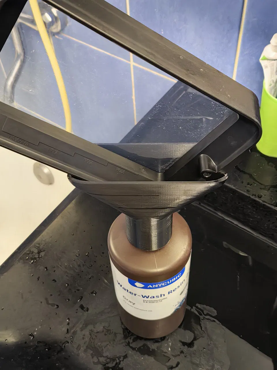 Phễu có ren xoáy trực tiếp vào miệng chai nhựa và cung cấp một nền tảng ổn định để giữ khay in trong khi chờ nhựa chảy hết. Thiết kế này chú trọng vào sự tin cậy, đơn giản và tính thực dụng trong quy trình in 3D hàng ngày.