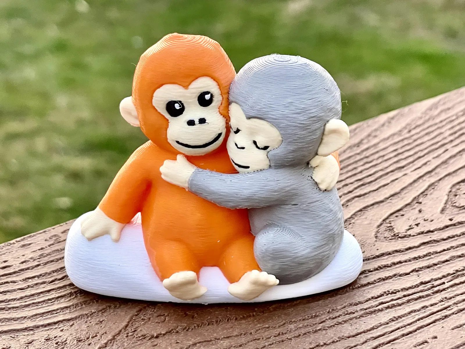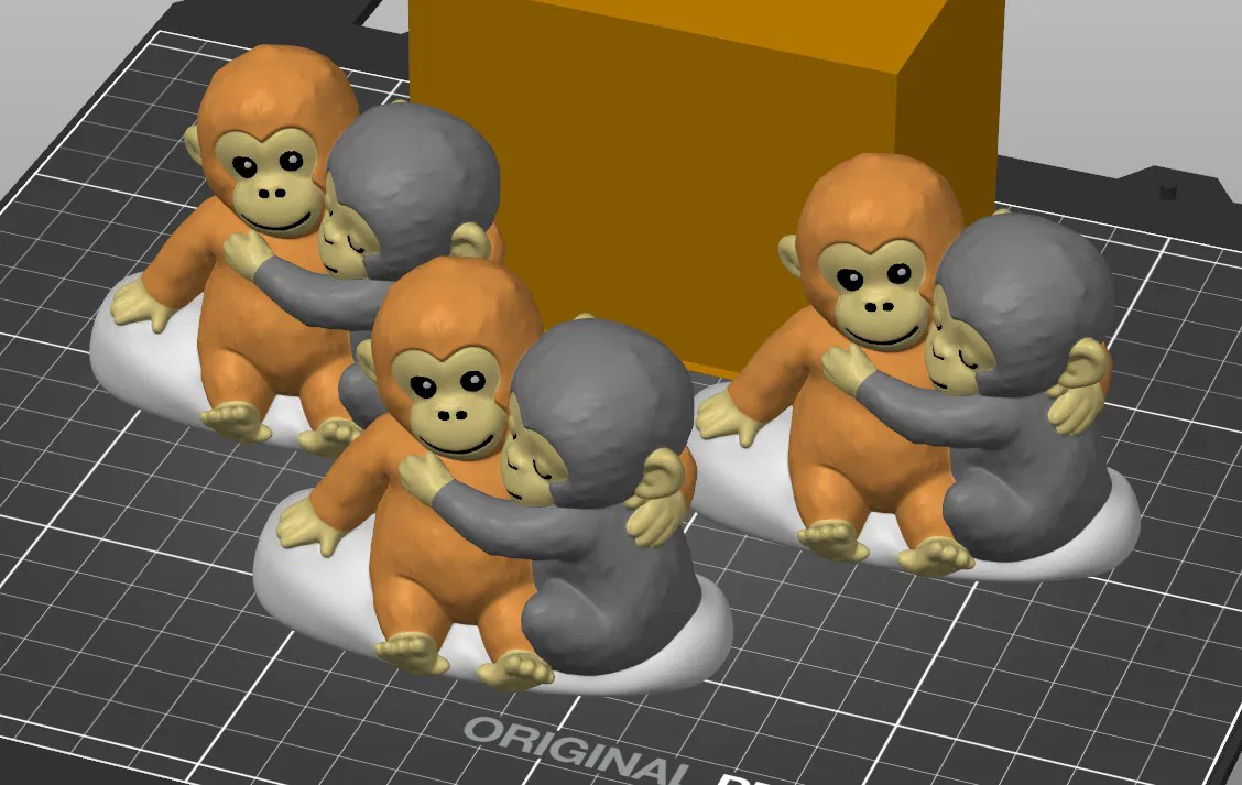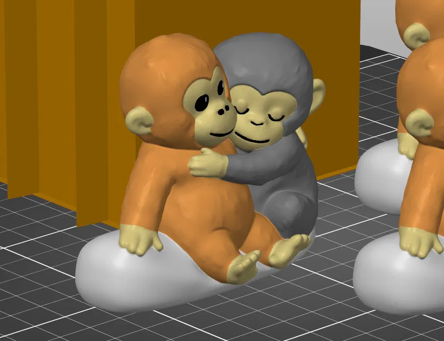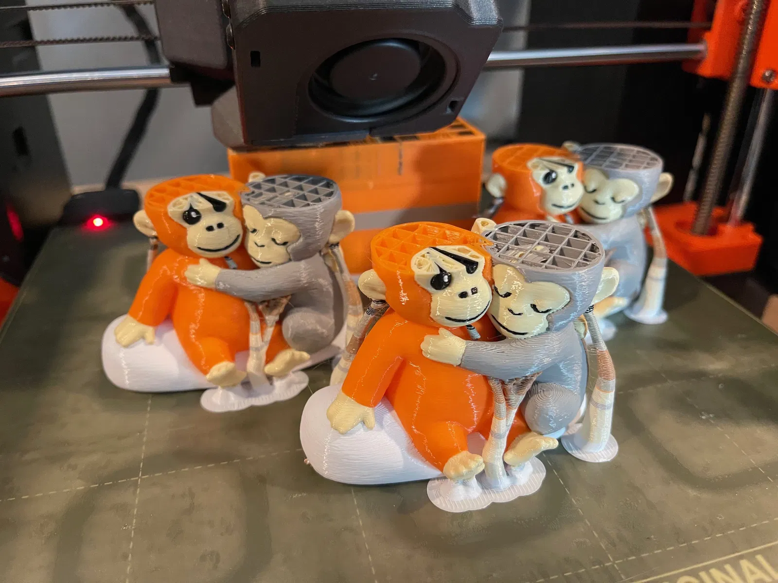 Đây là mô hình "Punch the Monkey" cùng người bạn của chú khỉ. Một bức ảnh cho thấy mô hình đang trong quá trình in thực tế. Tôi có làm một video trên YouTube để quay lại cảnh in các mô hình này. Ban đầu mô hình được tạo bằng AI, sau đó tôi đã chỉnh sửa thủ công và tô màu lại.