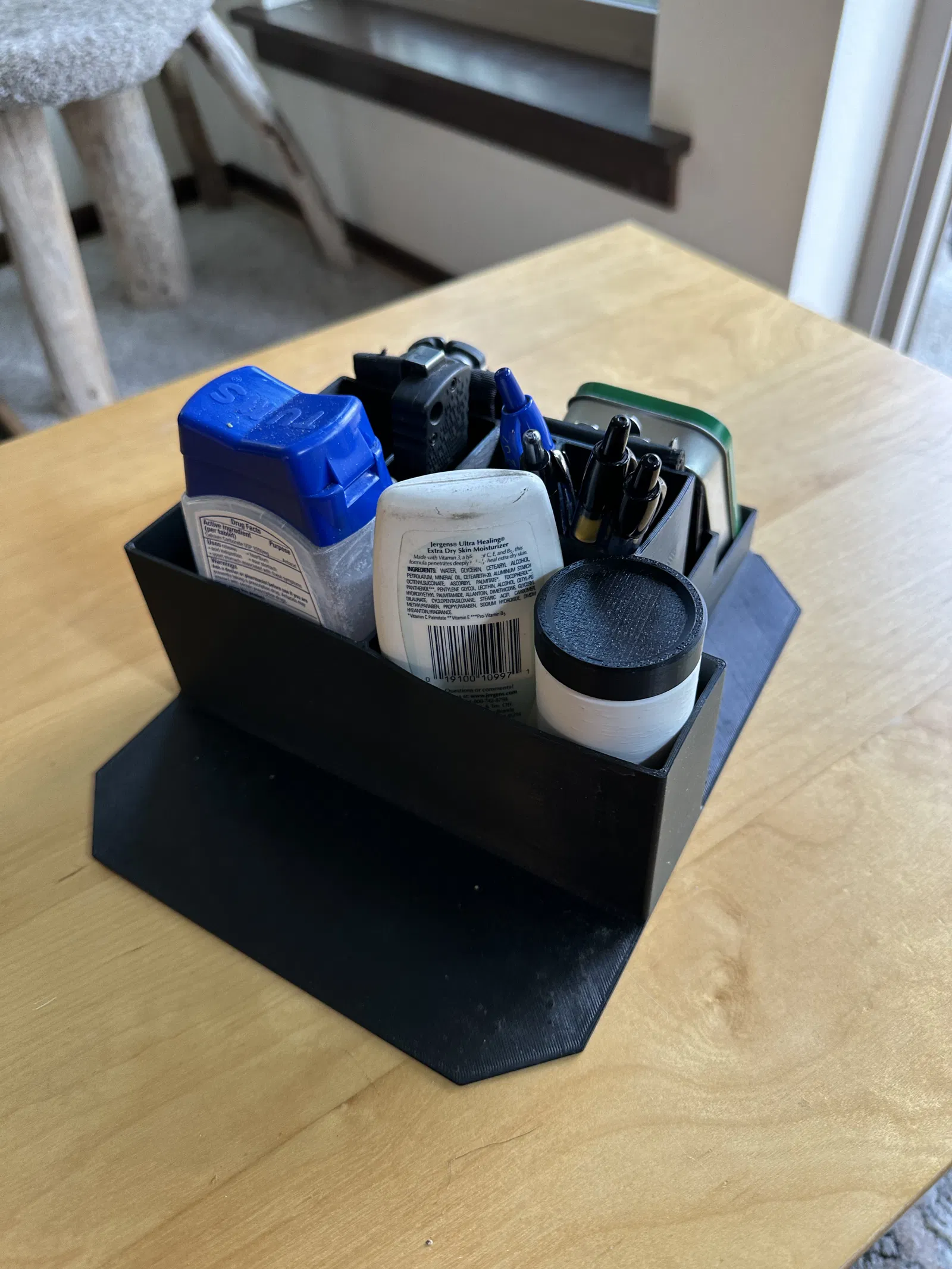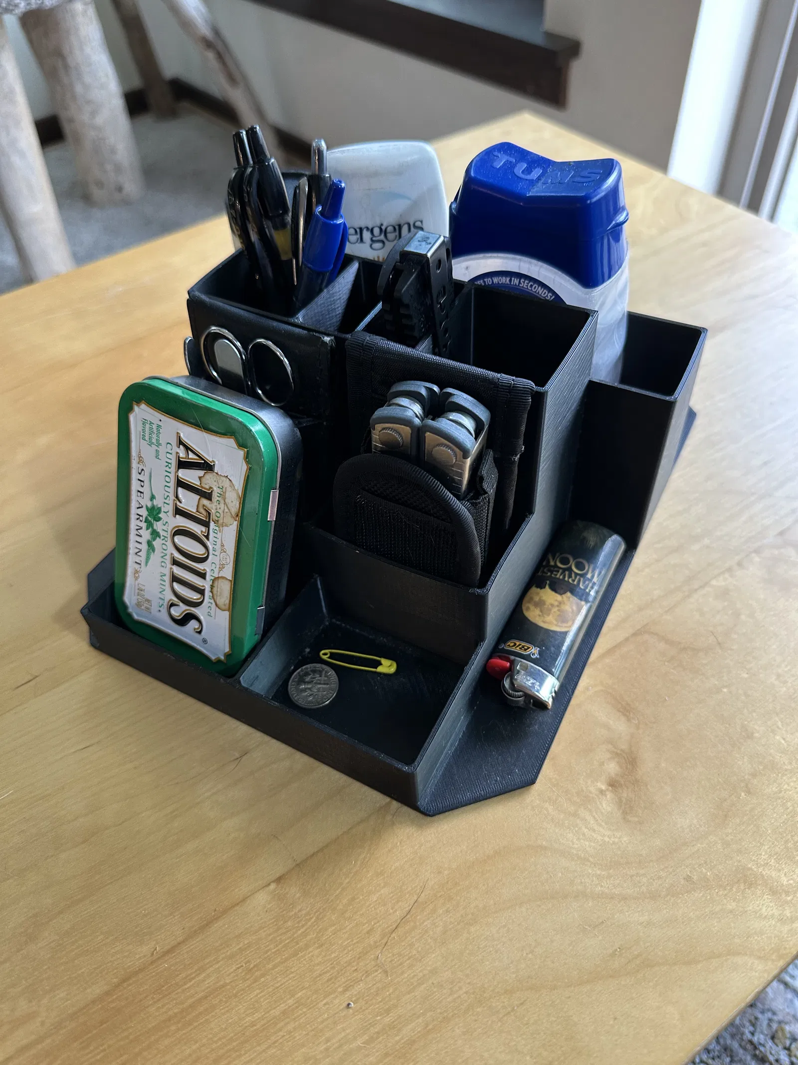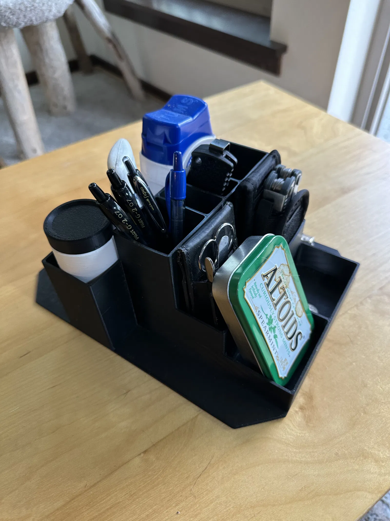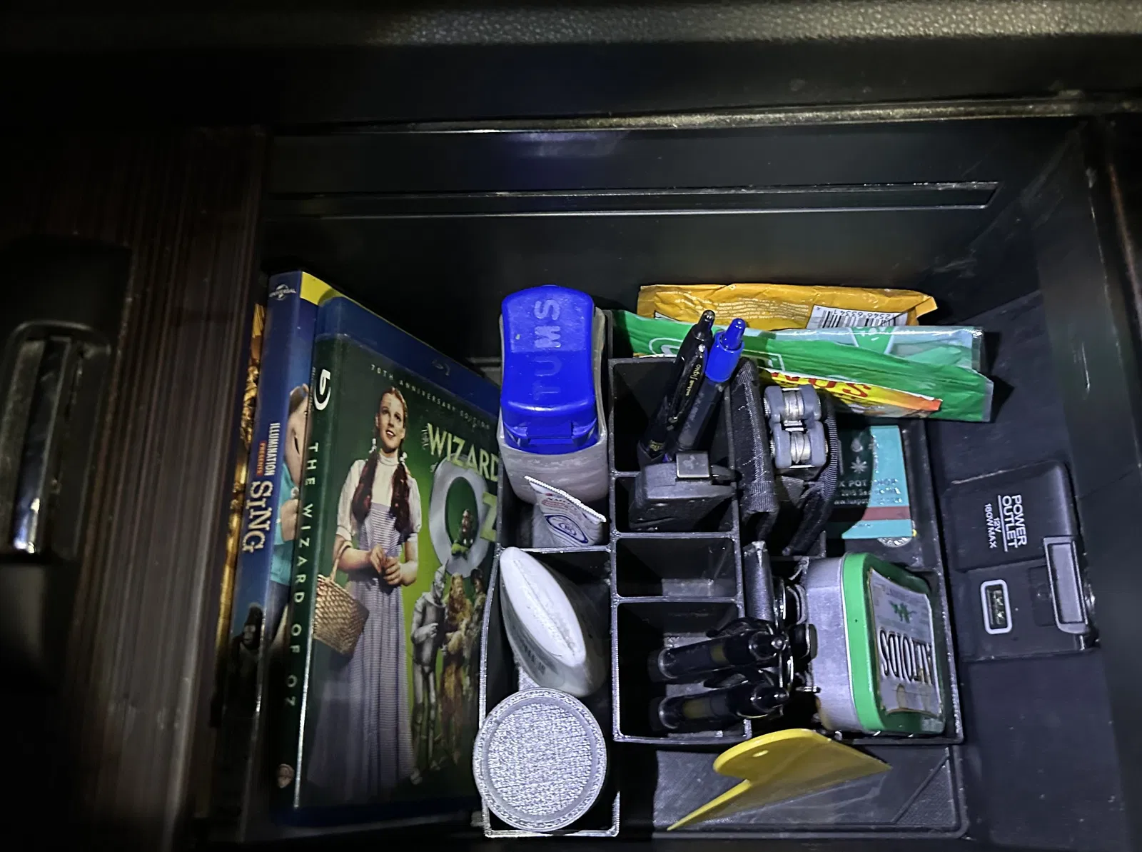 Thay vì phải để hết đồ dùng hằng ngày vào cái hộc chứa đồ sâu hoắm trên xe, mình đã thiết kế cái khay chia ngăn này để đặt gọn vào bên trong hộc trung tâm của dòng xe 2021 Honda Pilot. Nếu anh em đẩy khay sát về phía trước, mình vẫn có thể để vừa đĩa DVD hoặc Blue-ray ở phía sau, và nếu canh chỉnh đúng cách thì khay trượt của xe sẽ không bị vướng. Lưu ý nhỏ là nếu anh em cắm bút vào các ngăn cao ở giữa thì có thể sẽ làm cản trở chuyển động của khay trượt đấy nhé.