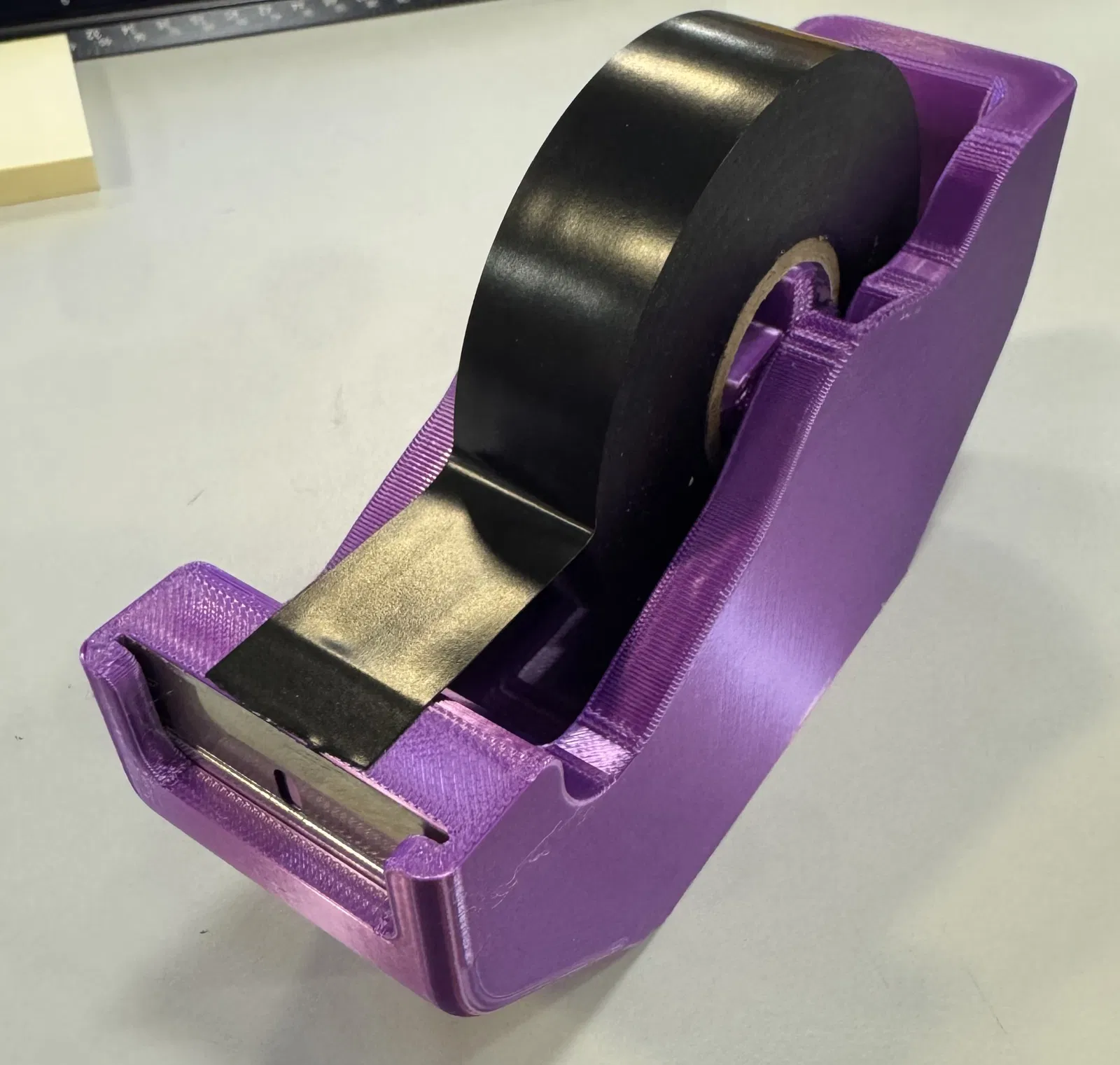 Mình cần một cách nhanh chóng để cắt băng keo điện khi làm dây điện mà cứ dùng kéo hoài thì hơi mệt. Mình đã thử dùng mấy cái đồ cắt băng keo văn phòng loại thường nhưng cuộn băng keo điện lại có đường kính lớn quá, nên mình quyết định tự thiết kế riêng một cái. Hiện tại, thiết kế này dùng lưỡi dao lam một cạnh để cắt (có thể sau này mình sẽ thử dùng lưỡi cưa sắt hoặc cái gì đó bớt sắc bén hơn, nhưng tại mình còn dư nhiều lưỡi lam lúc cắt ống co nhiệt nên tận dụng luôn).