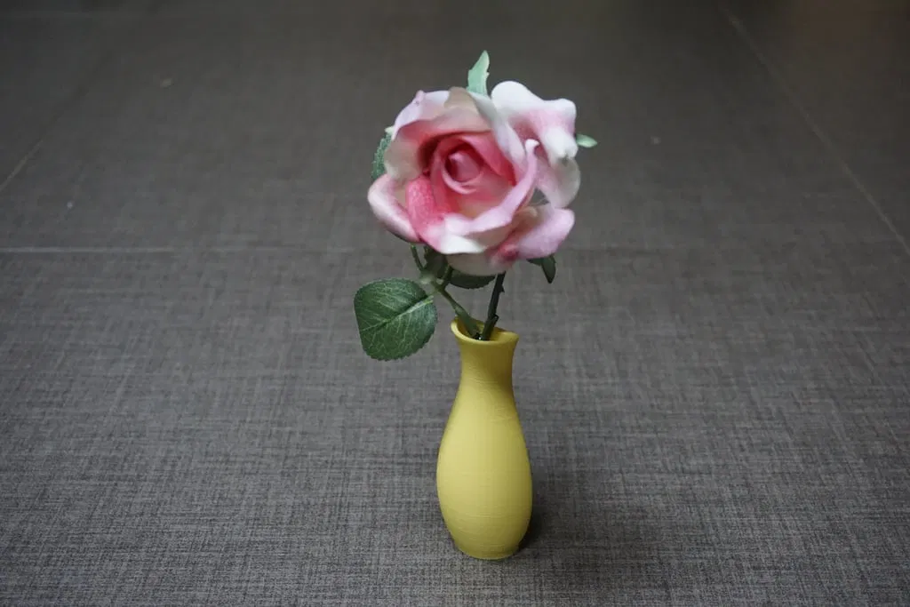 Mình in với 2 đường perimeters, chiều cao lớp in 0.2 mm và đầu phun 0.4 mm. Nếu bạn giữ nguyên hình dạng mặc định thì không cần support đâu, nhưng nếu bàn in của bạn độ bám kém thì nên dùng thêm brim. Tùy vào khả năng in overhang của máy mà mép trên các lỗ nam châm có thể bị võng nhẹ một chút, bạn chỉ cần dùng dao tỉa nhẹ là sạch đẹp. Hãy dán nam châm vào bằng loại keo yêu thích (keo 502 dùng rất tốt). Bạn có thể mua hoa giả ở các cửa hàng lưu niệm, hãy mang theo bình để ướm thử xem cuống hoa có lọt không nhé. Cắt ngắn cuống hoa cho vừa vặn, nếu cần thì nhét thêm giấy ăn vào lòng bình để giữ hoa đứng thẳng.