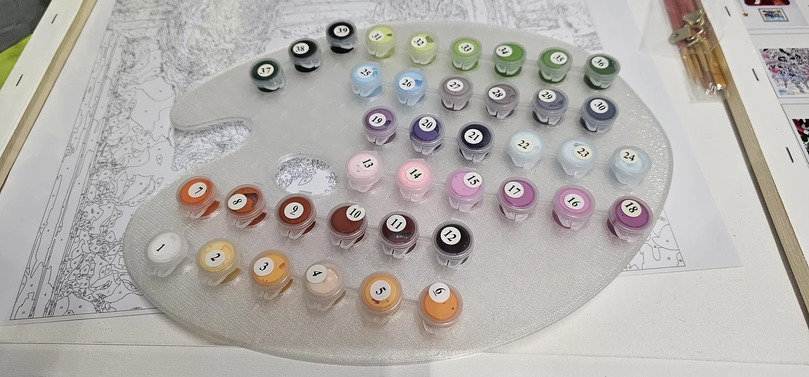 Bảng pha màu dùng cho tranh tô màu theo số, được thiết kế với 39 lỗ chứa hũ màu có đường kính 18 mm. Mẫu này khá tiện lợi và dễ sử dụng cho những ai đam mê hội họa.