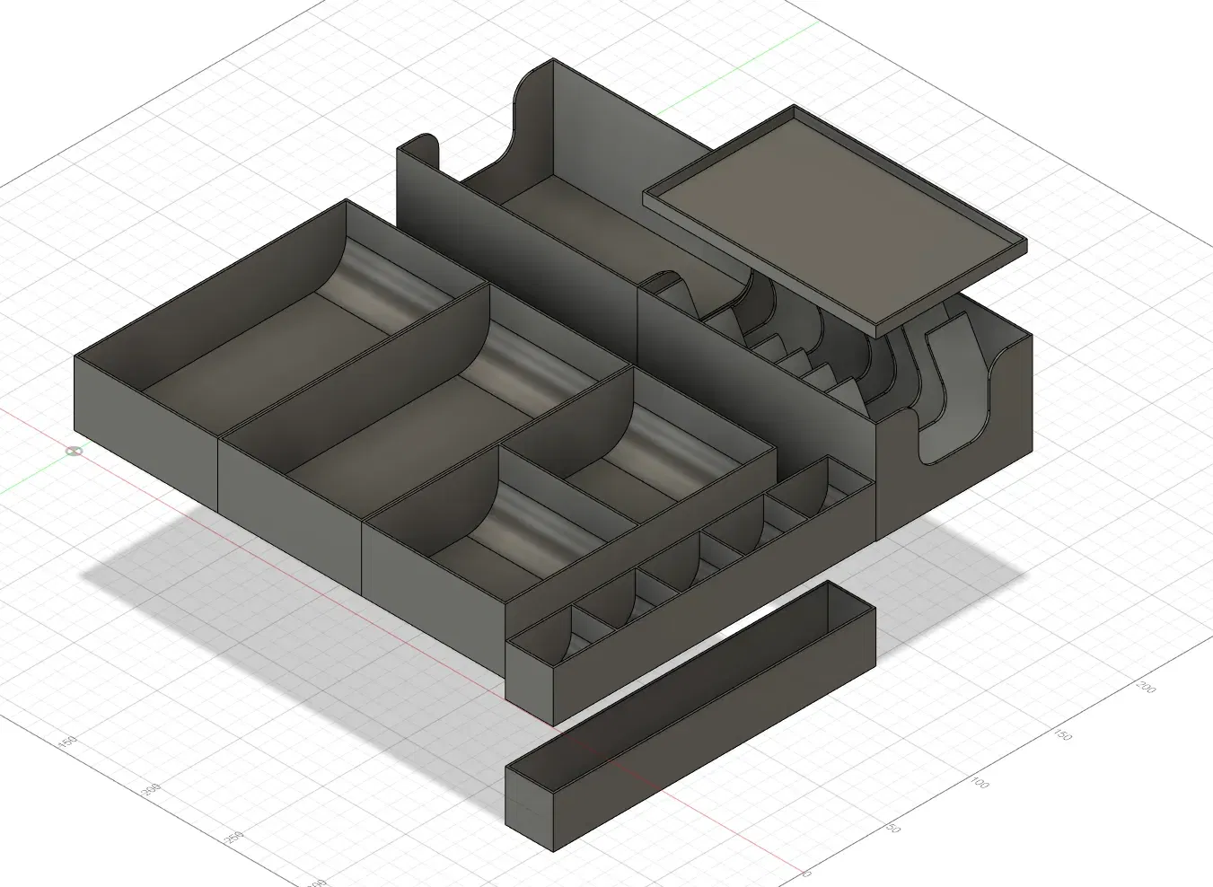 Đây là một bộ khay để giúp tổ chức các thành phần cho trò chơi board game Earth phát hành vào năm 2023. Nhà xuất bản đã phát hành một bộ 5 tấm thảm neoprene cho bảng của người chơi, và đây là nỗ lực của tôi để lưu trữ gọn gàng các tấm thảm và tất cả các thành phần trò chơi trong hộp trò chơi gốc. Nhà xuất bản trò chơi đã nâng cấp các token mầm thành các khối gỗ, vì vậy tôi đã mua các khối gỗ màu đen để thay thế cho các token đất bằng bìa cứng. Có đủ chỗ trong khay phân cách để lưu trữ các thành phần bằng bìa cứng gốc. Các tấm thảm người chơi neoprene được thiết kế để xếp chồng lên nhau và được uốn nhẹ qua các khay mầm, tán lá và khối. Có đủ không gian giữa đỉnh của các khay và đáy của các viên gạch chipboard để vừa vặn tất cả năm tấm thảm, tạo ra một lớp đệm chặt để giữ các thành phần ở vị trí. Cập nhật phiên bản thẻ có bao: - đã thêm nhiều không gian hơn cho các thẻ có bao. Tôi đã sử dụng bao nhẹ (không phải cao cấp). Nếu sử dụng thẻ có bao cao cấp, có thể sẽ chật chội - đã nghiêng một số khe thẻ để thẻ điểm có thể vừa ở trên cùng