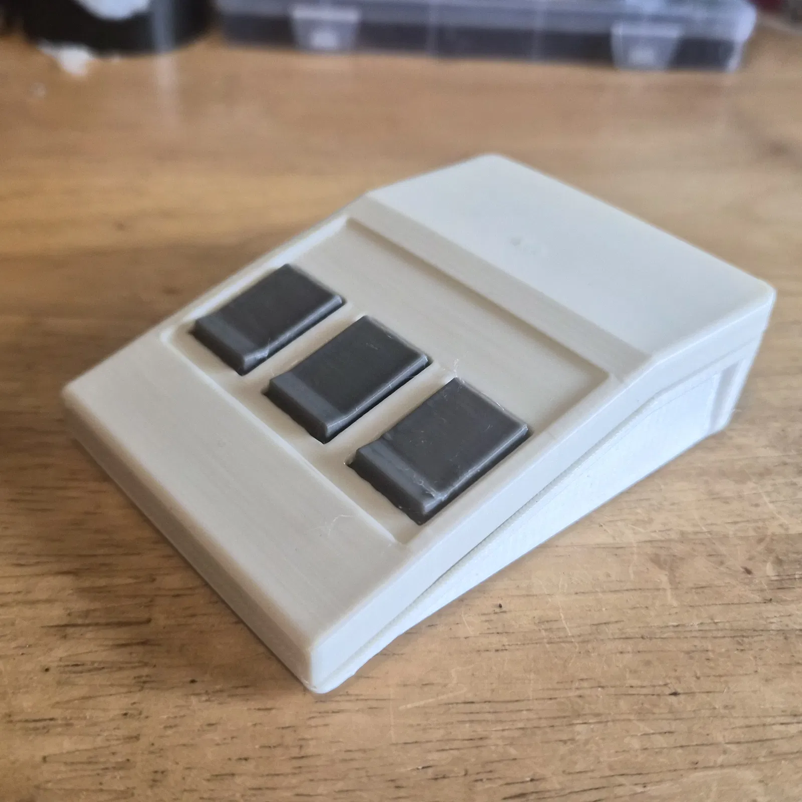 Trong bản in mẫu, mình dùng nhựa PETG. Các nút bấm cần độ dẻo một chút để hoạt động chính xác, dù dùng PLA cũng có thể ổn. Hình ảnh mẫu của mình sử dụng nhựa SUNLU PETG màu Trắng xương (Bone White) và Xám.